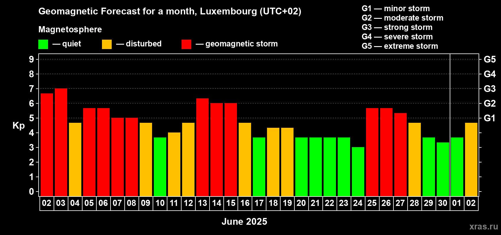Geomagnetic storm forecast in Luxembourg for Jun 02, 2025