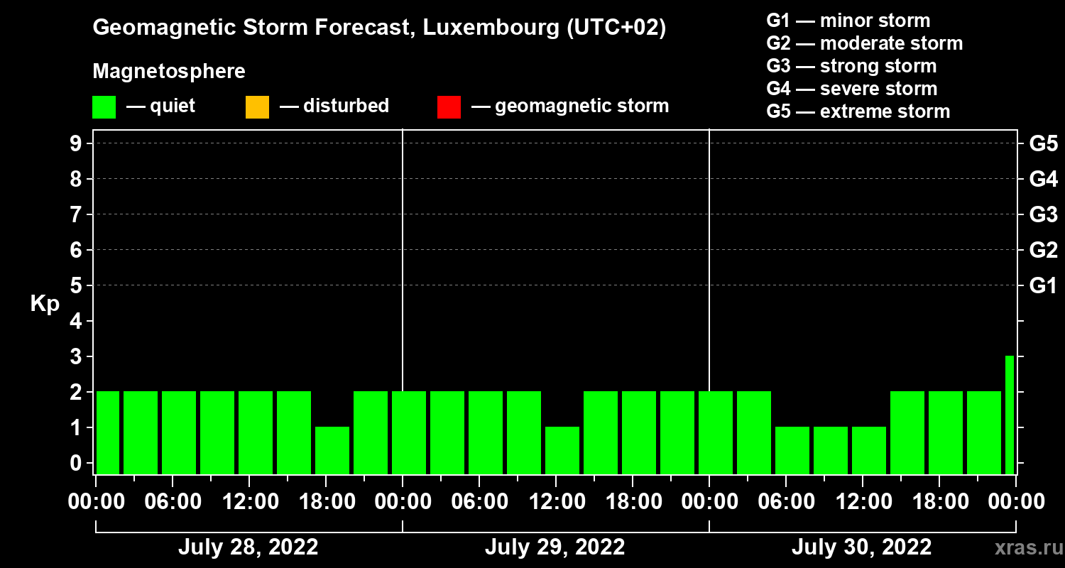 Geomagnetic storm forecast in Luxembourg for Jul 28, 2022