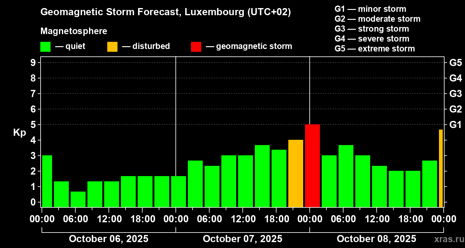 Geomagnetic storm forecast in Luxembourg for Oct 06, 2025