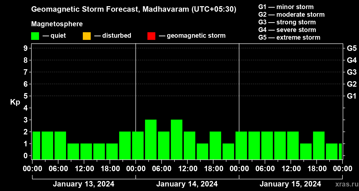 Geomagnetic storm forecast in Madhavaram for Jan 13, 2024
