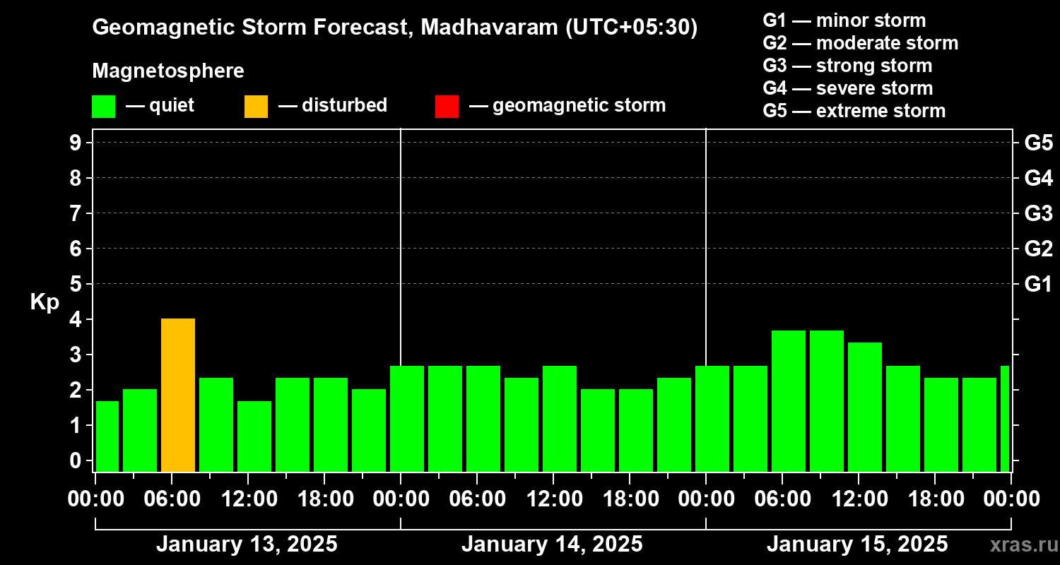 Geomagnetic storm forecast in Madhavaram for Jan 13, 2025