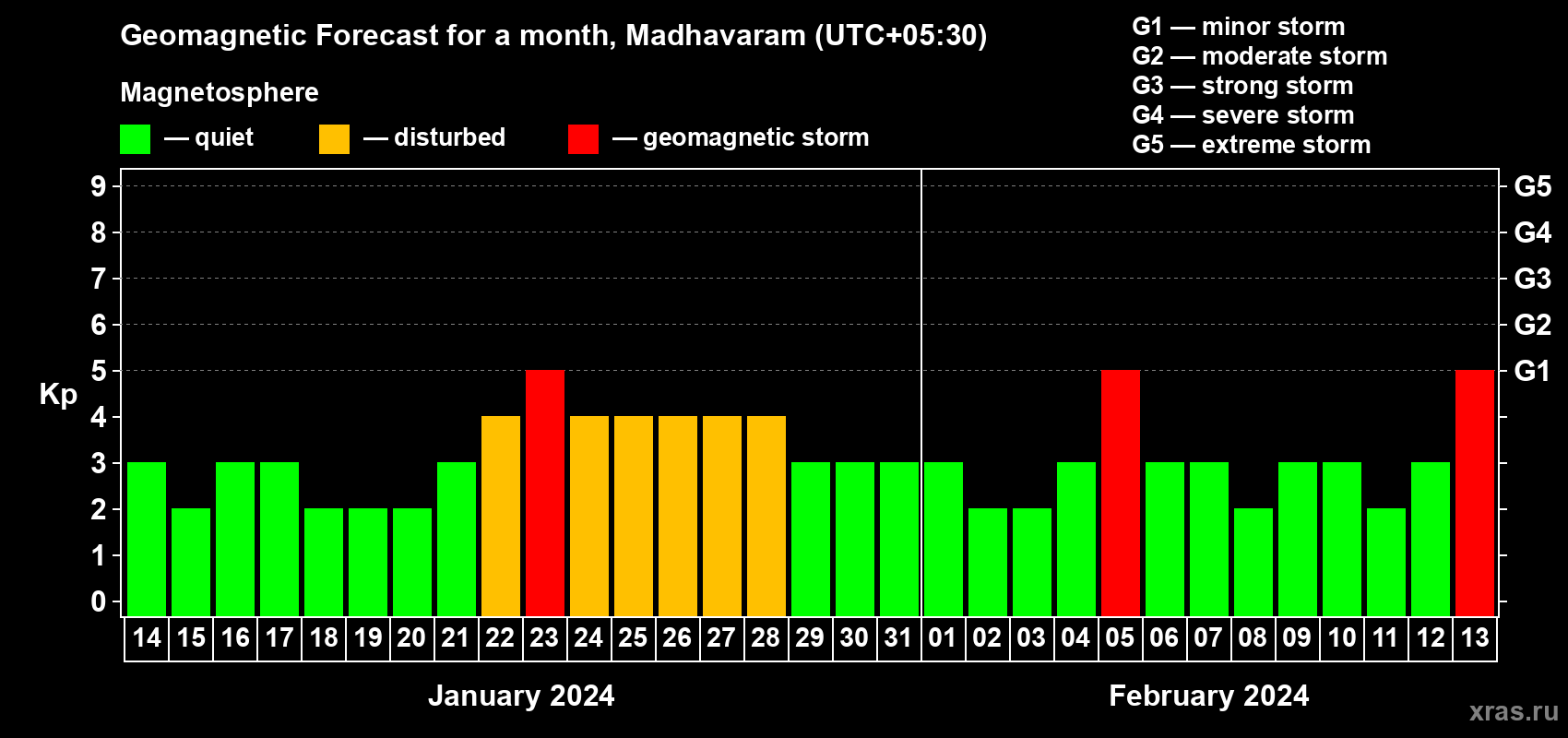 Geomagnetic storm forecast in Madhavaram for Jan 14, 2024