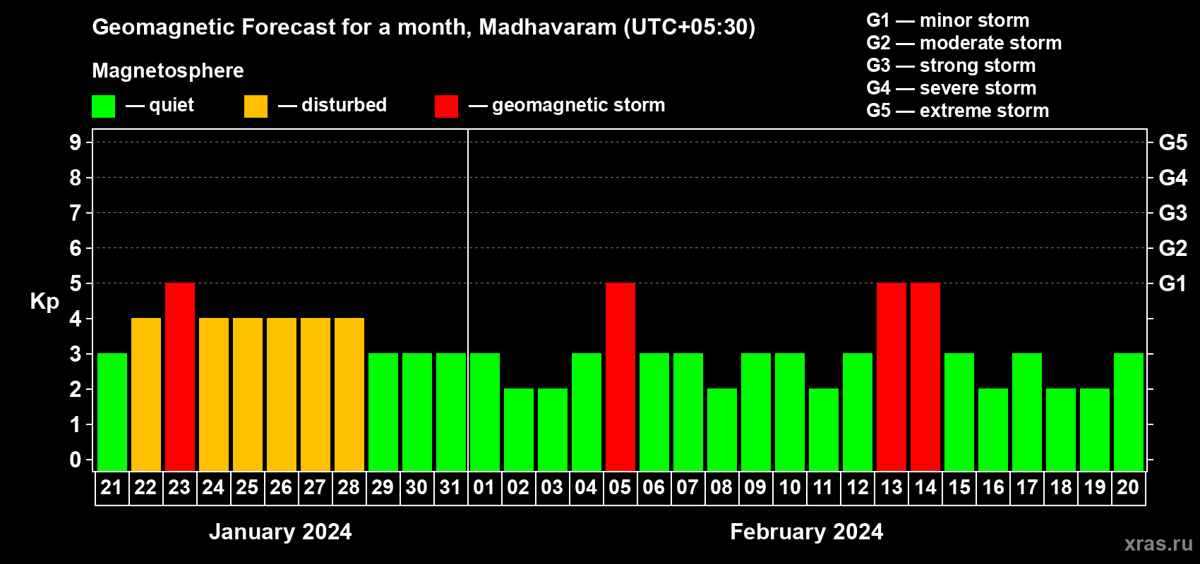 Geomagnetic storm forecast in Madhavaram for Jan 21, 2024
