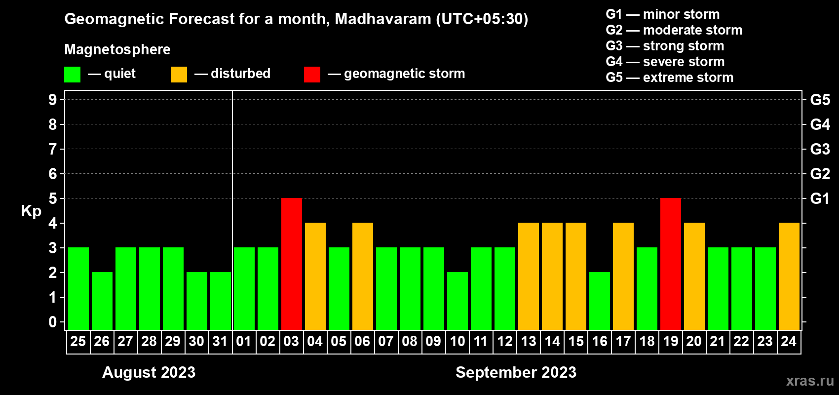 Geomagnetic storm forecast in Madhavaram for Aug 25, 2023
