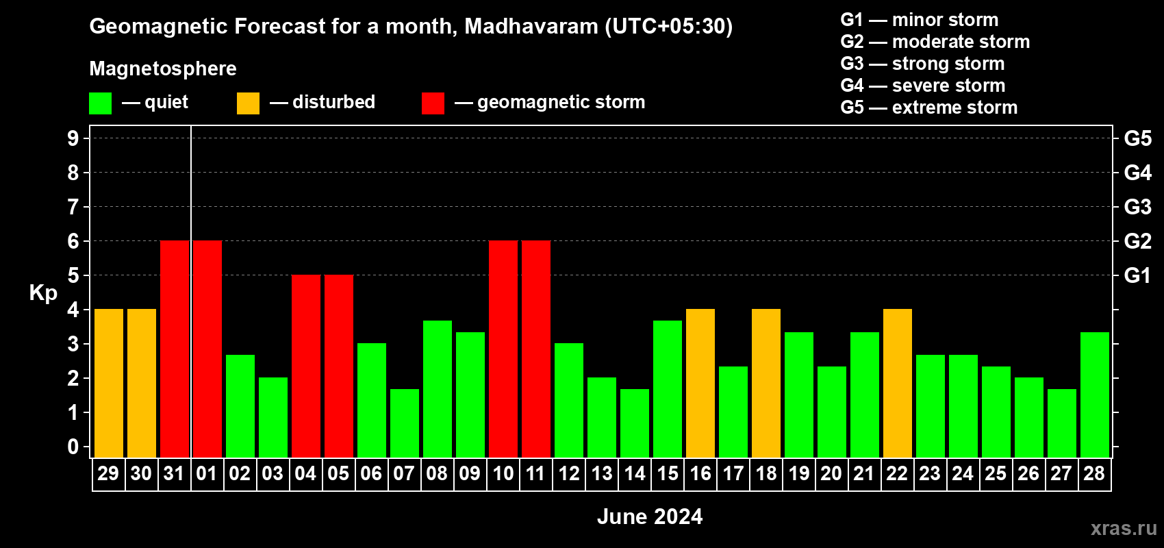 Geomagnetic storm forecast in Madhavaram for May 29, 2024