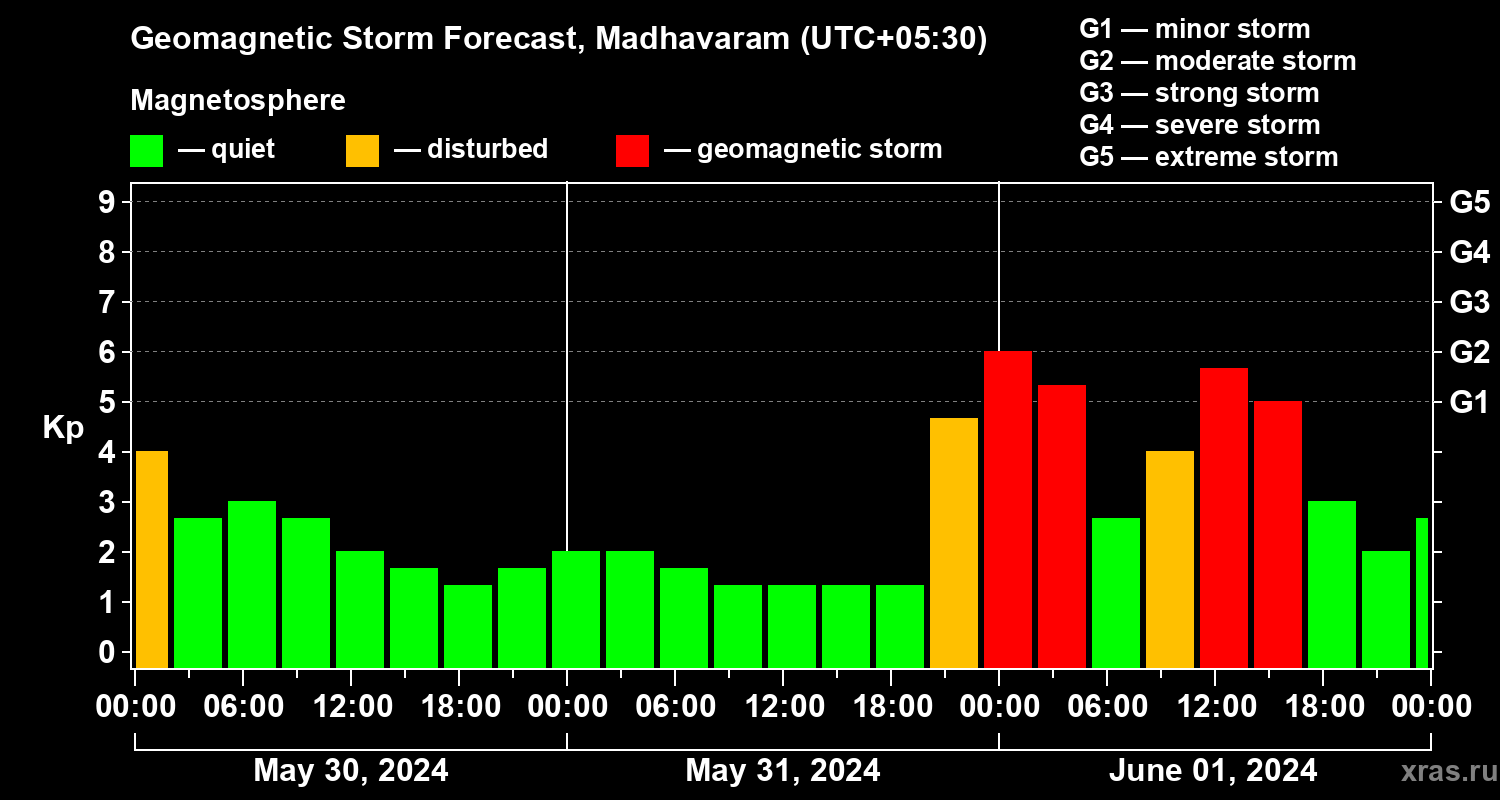 Geomagnetic storm forecast in Madhavaram for May 30, 2024