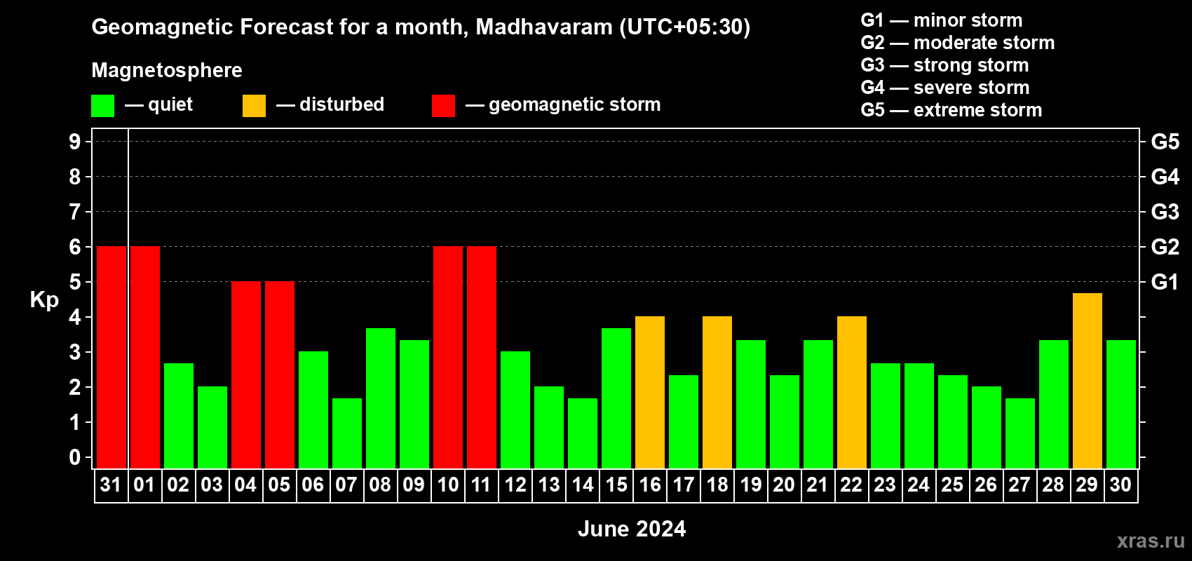 Geomagnetic storm forecast in Madhavaram for May 31, 2024