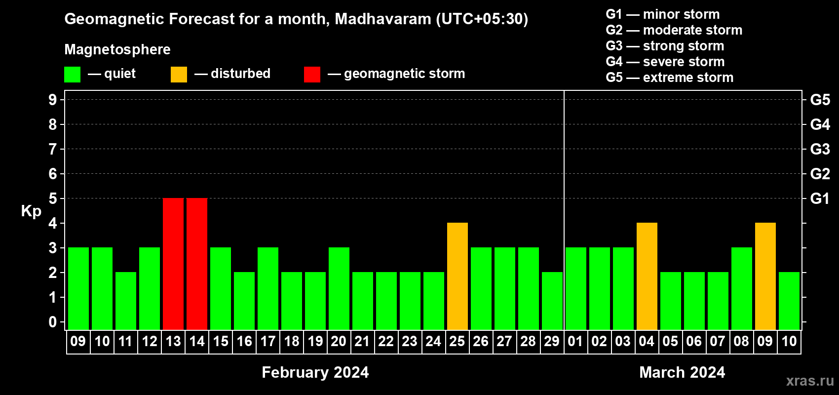 Geomagnetic storm forecast in Madhavaram for Feb 09, 2024