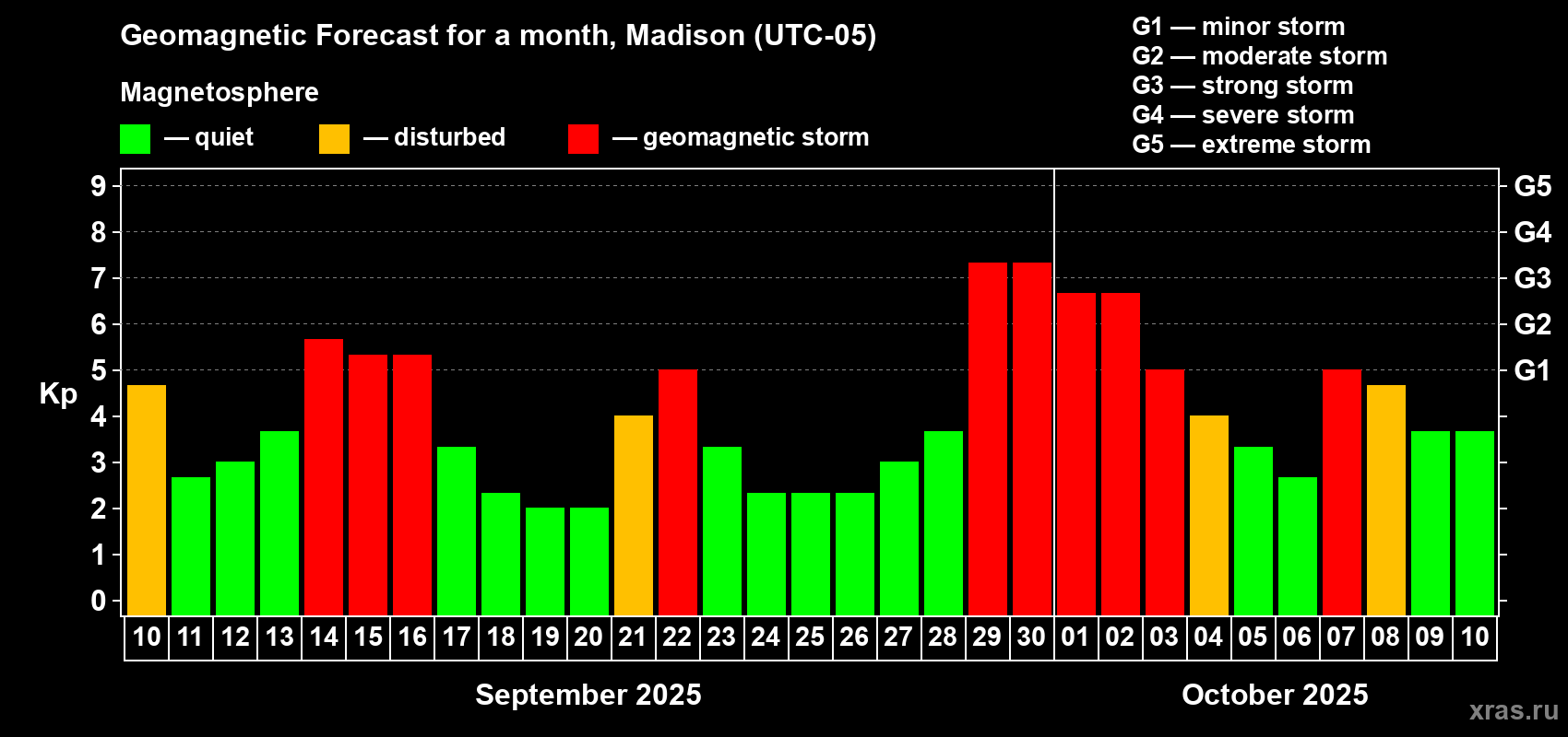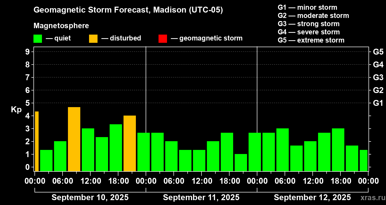 Geomagnetic storm forecast in Madison for Sep 10, 2025