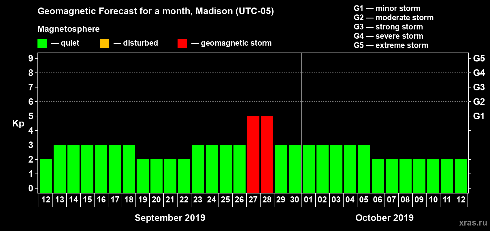 Geomagnetic storm forecast in Madison for Sep 12, 2019