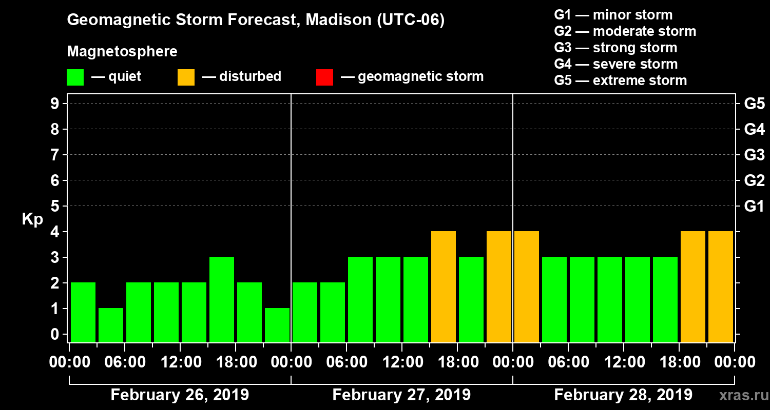 Geomagnetic storm forecast in Madison for Feb 26, 2019