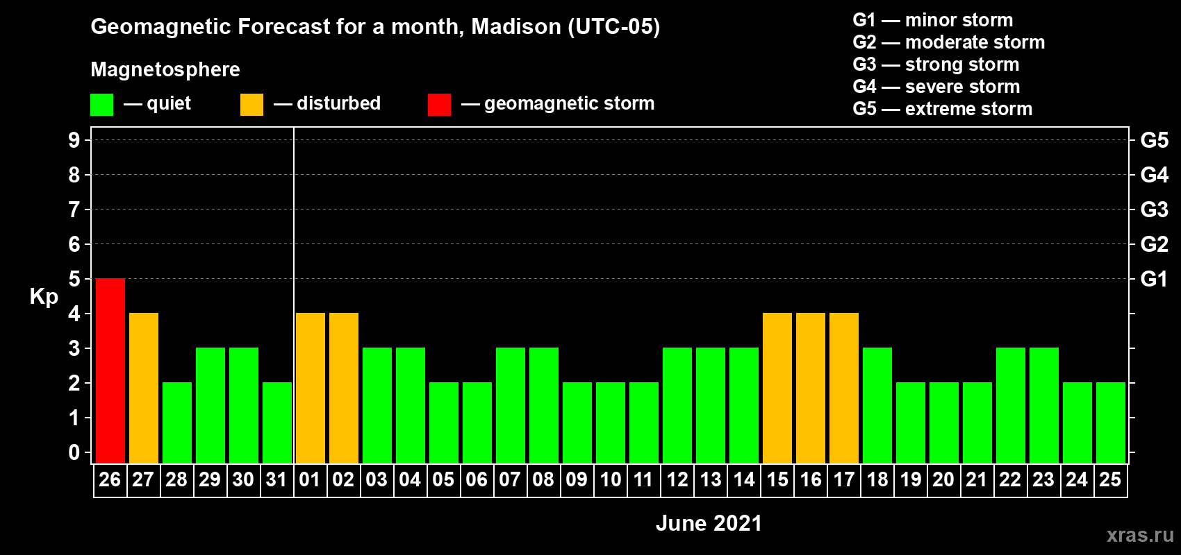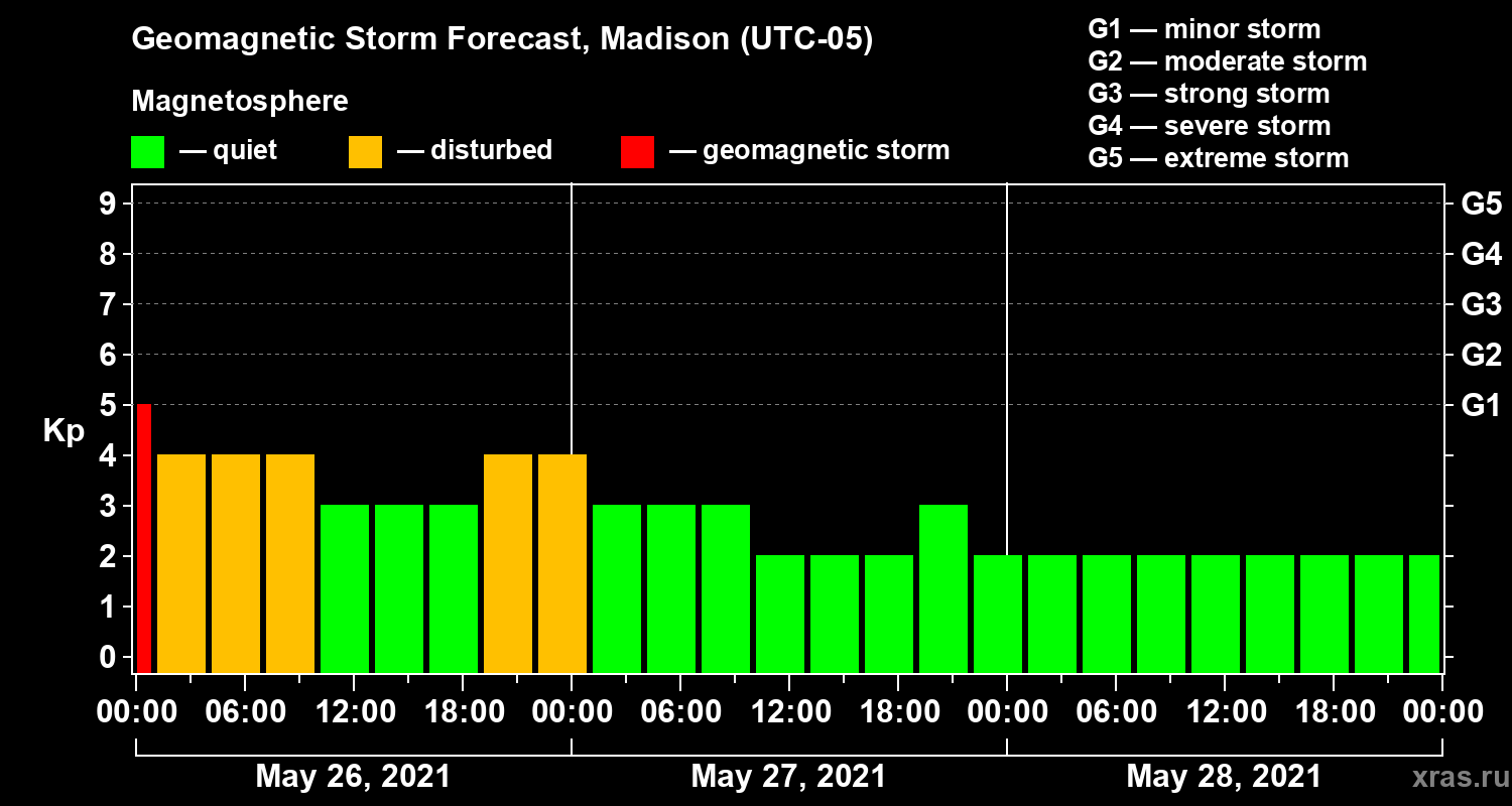 Geomagnetic storm forecast in Madison for May 26, 2021