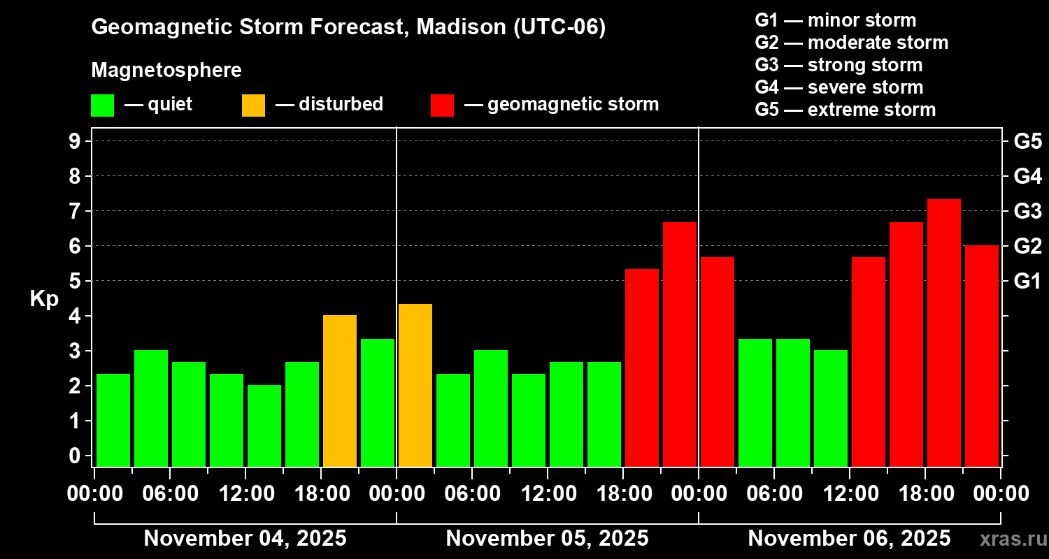 Geomagnetic storm forecast in Madison for Nov 04, 2025
