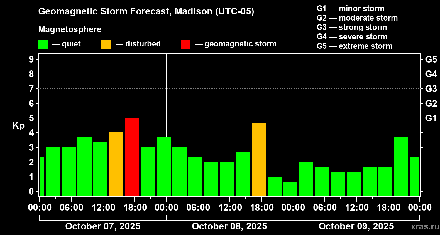 Geomagnetic storm forecast in Madison for Oct 07, 2025