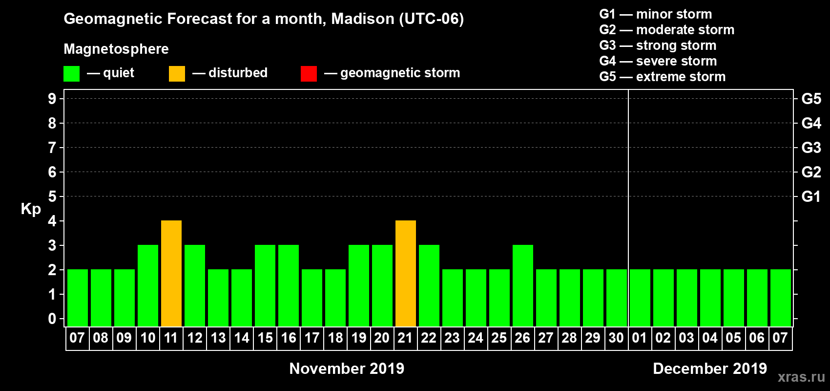 Geomagnetic storm forecast in Madison for Nov 07, 2019