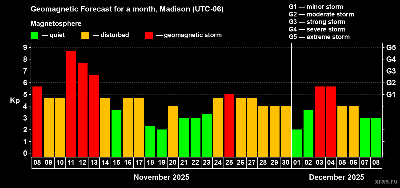 Geomagnetic storm forecast in Madison for Nov 08, 2025