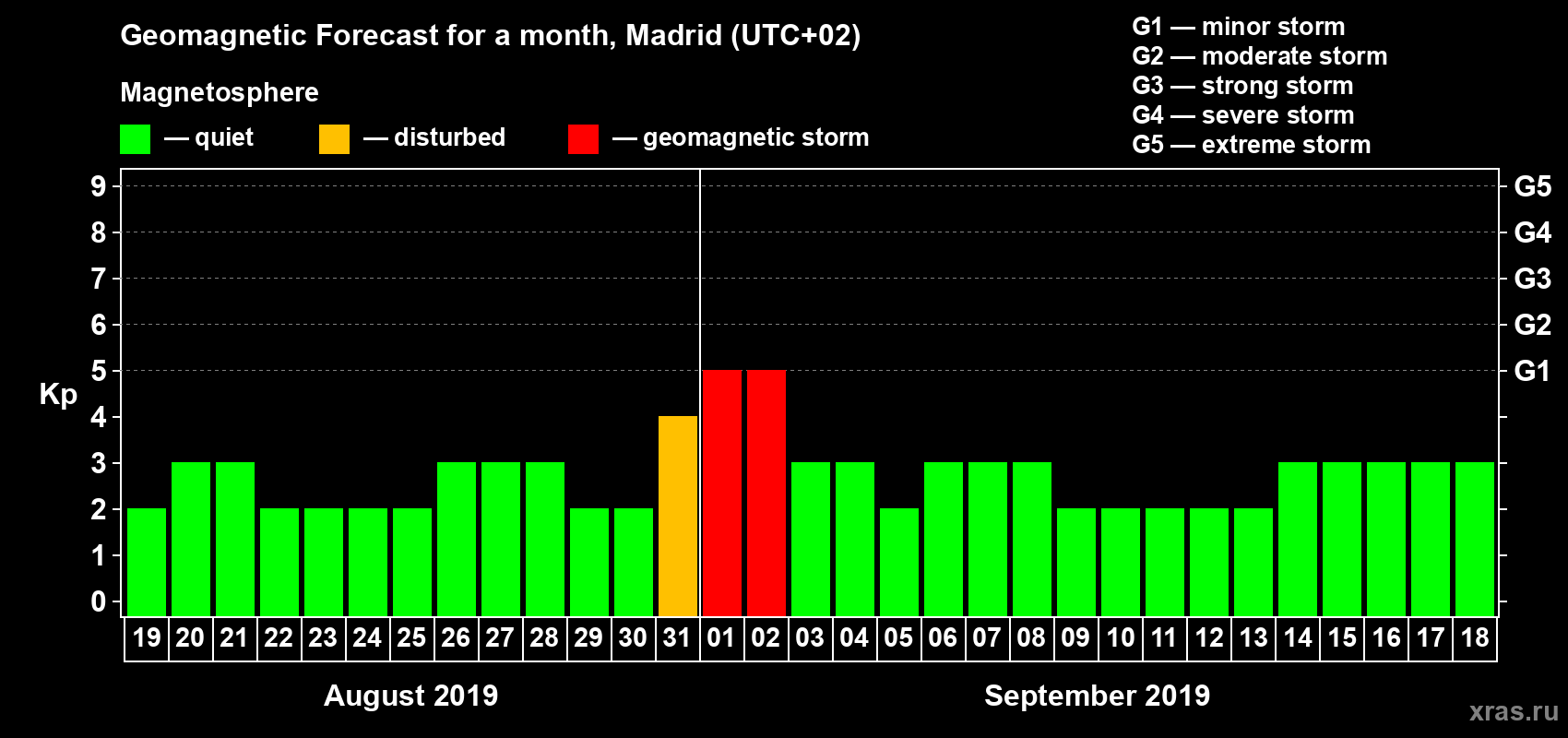 Geomagnetic storm forecast in Madrid for Aug 19, 2019