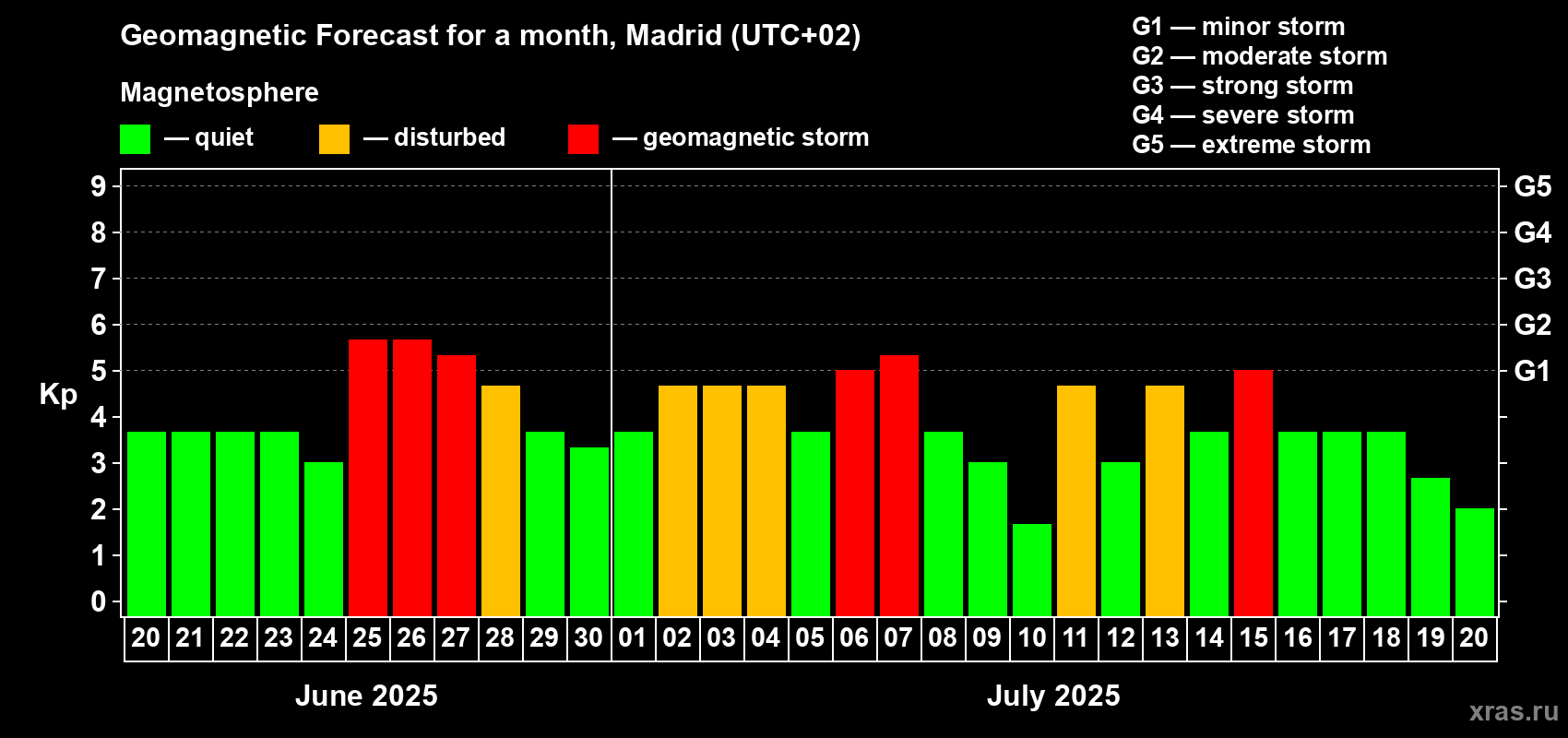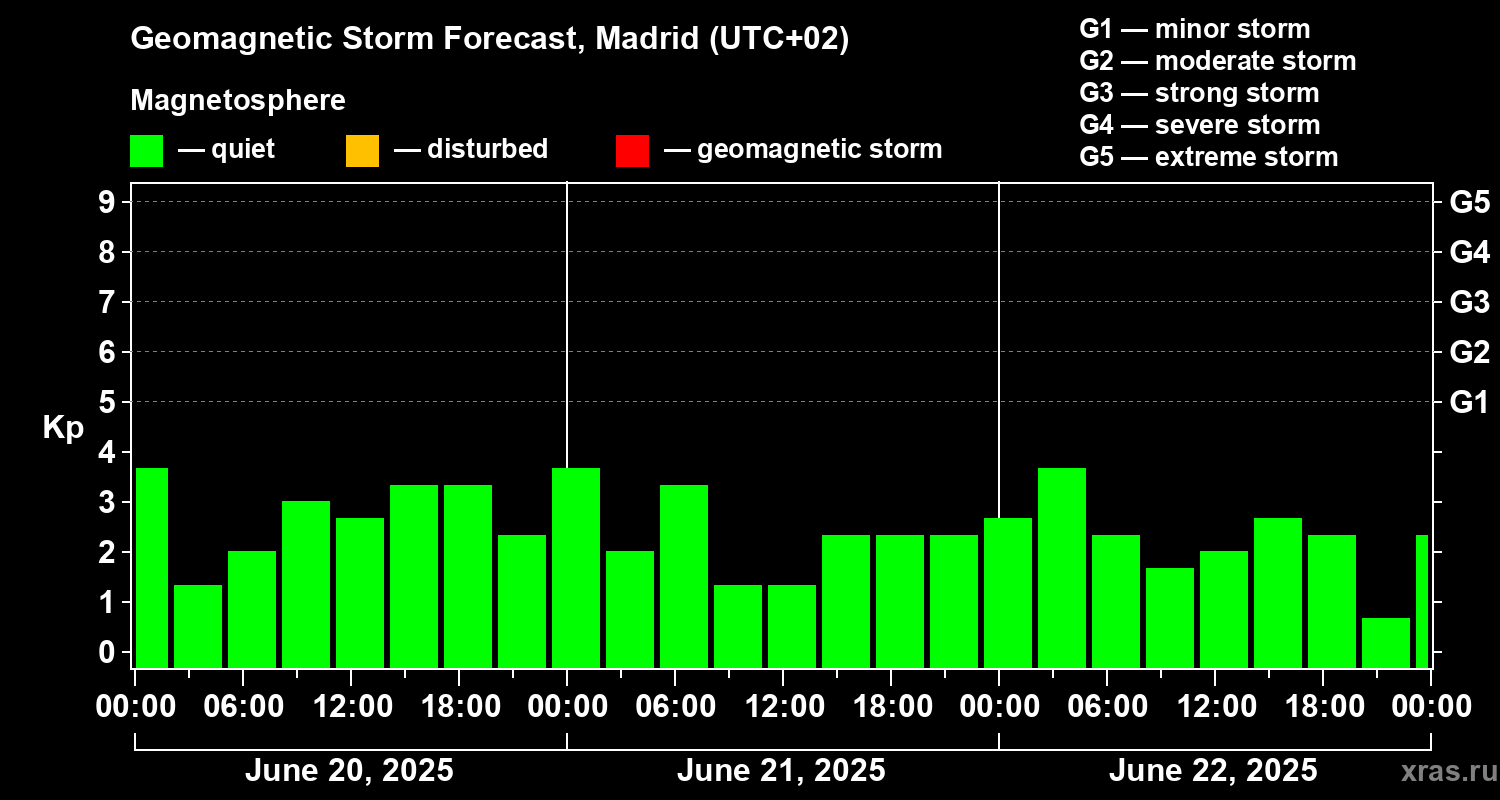 Geomagnetic storm forecast in Madrid for Jun 20, 2025