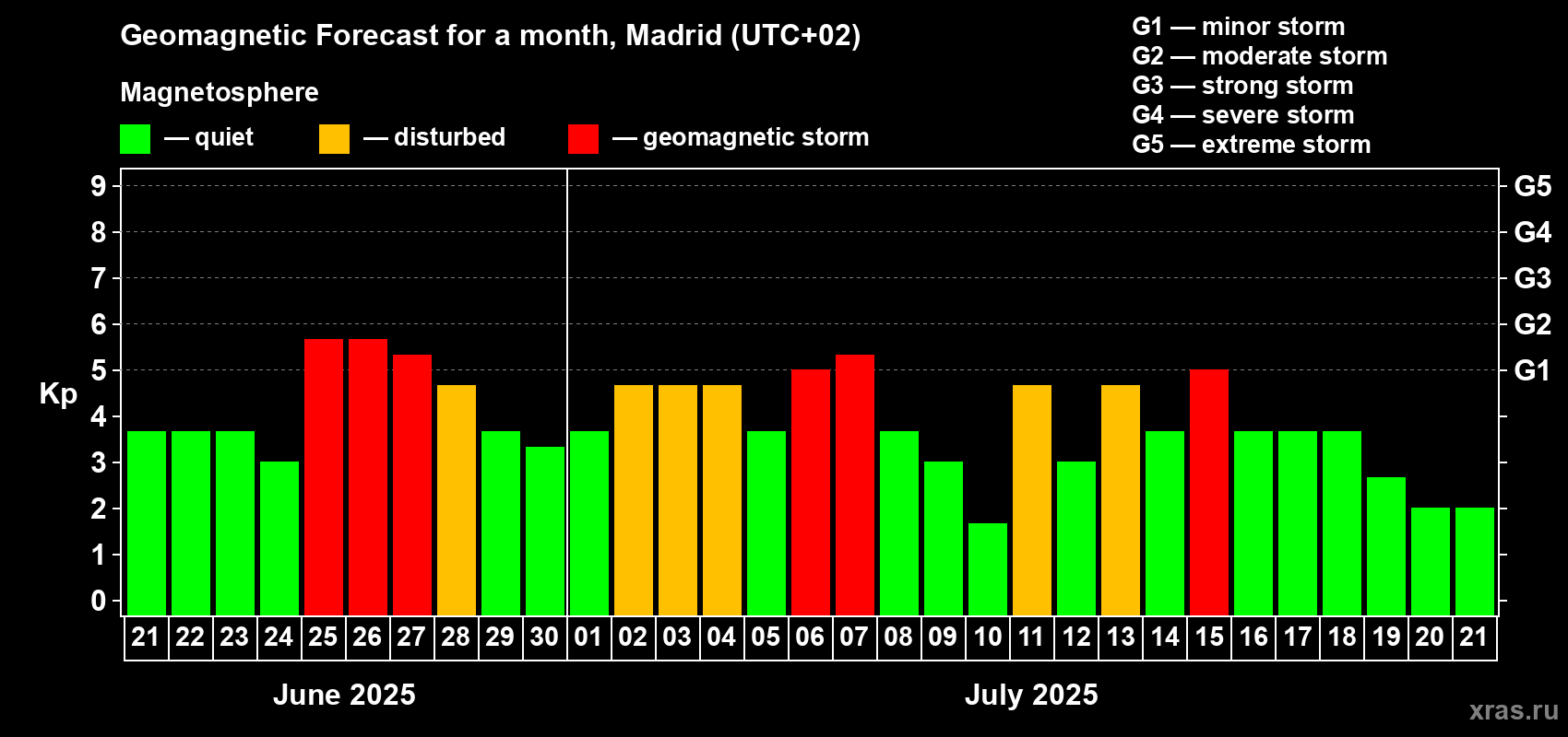 Geomagnetic storm forecast in Madrid for Jun 21, 2025