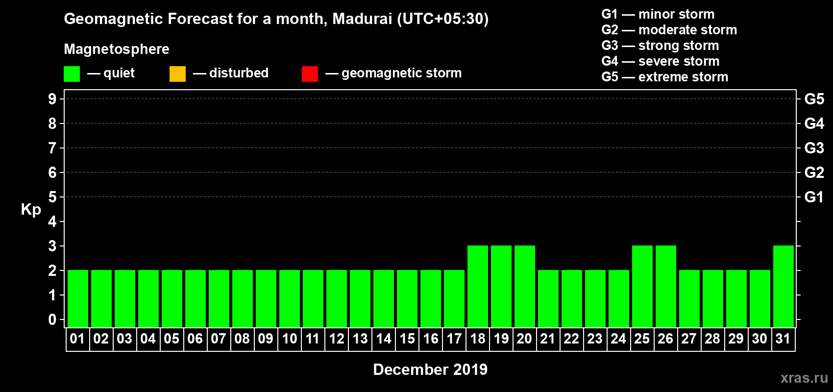Geomagnetic storm forecast in Madurai for Dec 01, 2019