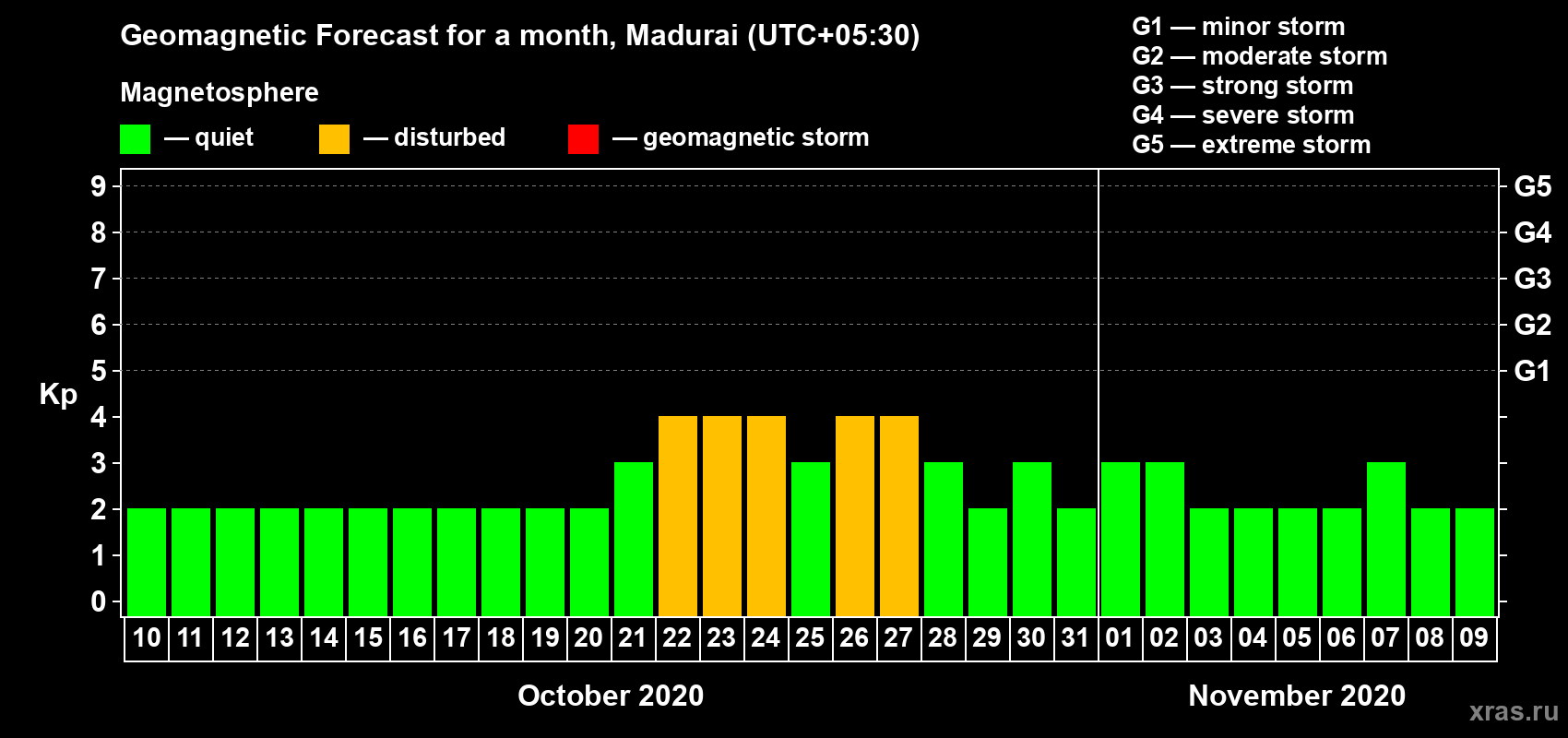 Geomagnetic storm forecast in Madurai for Oct 10, 2020