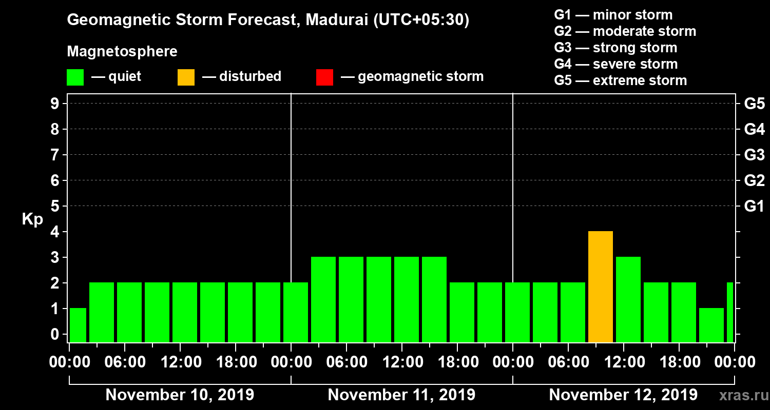 Geomagnetic storm forecast in Madurai for Nov 10, 2019
