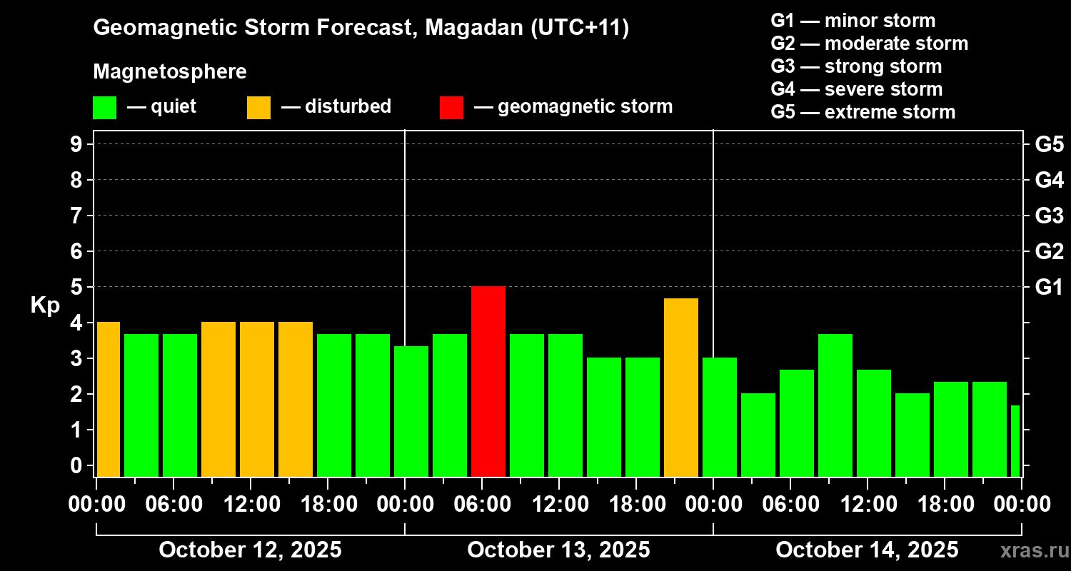 Geomagnetic storm forecast in Magadan for Oct 12, 2025