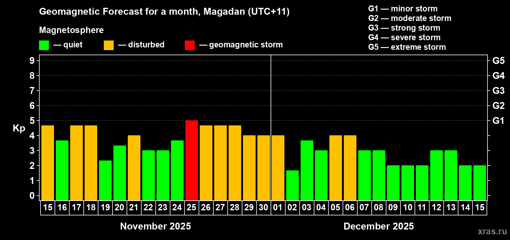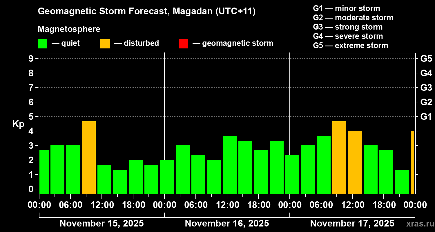 Geomagnetic storm forecast in Magadan for Nov 15, 2025