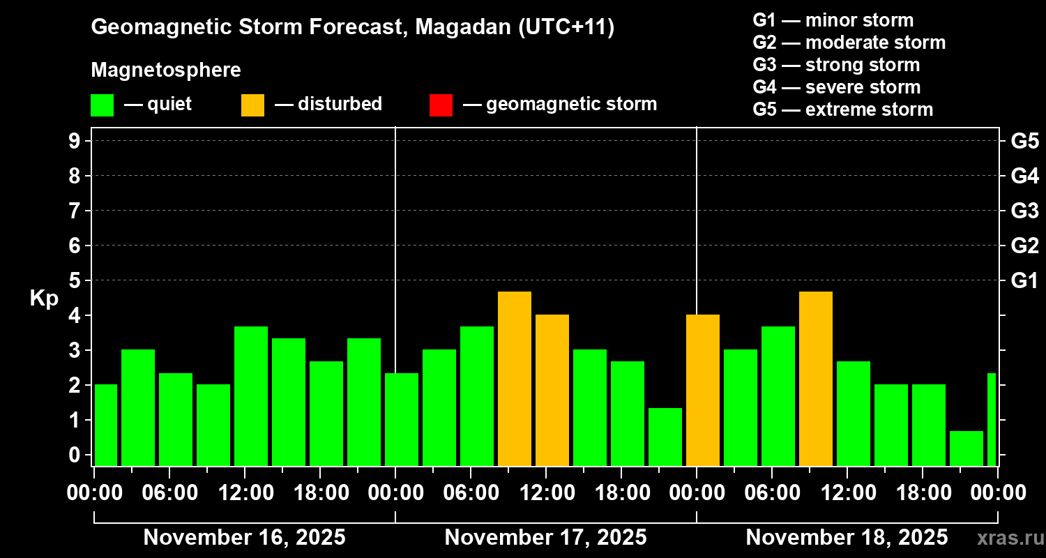 Geomagnetic storm forecast in Magadan for Nov 16, 2025
