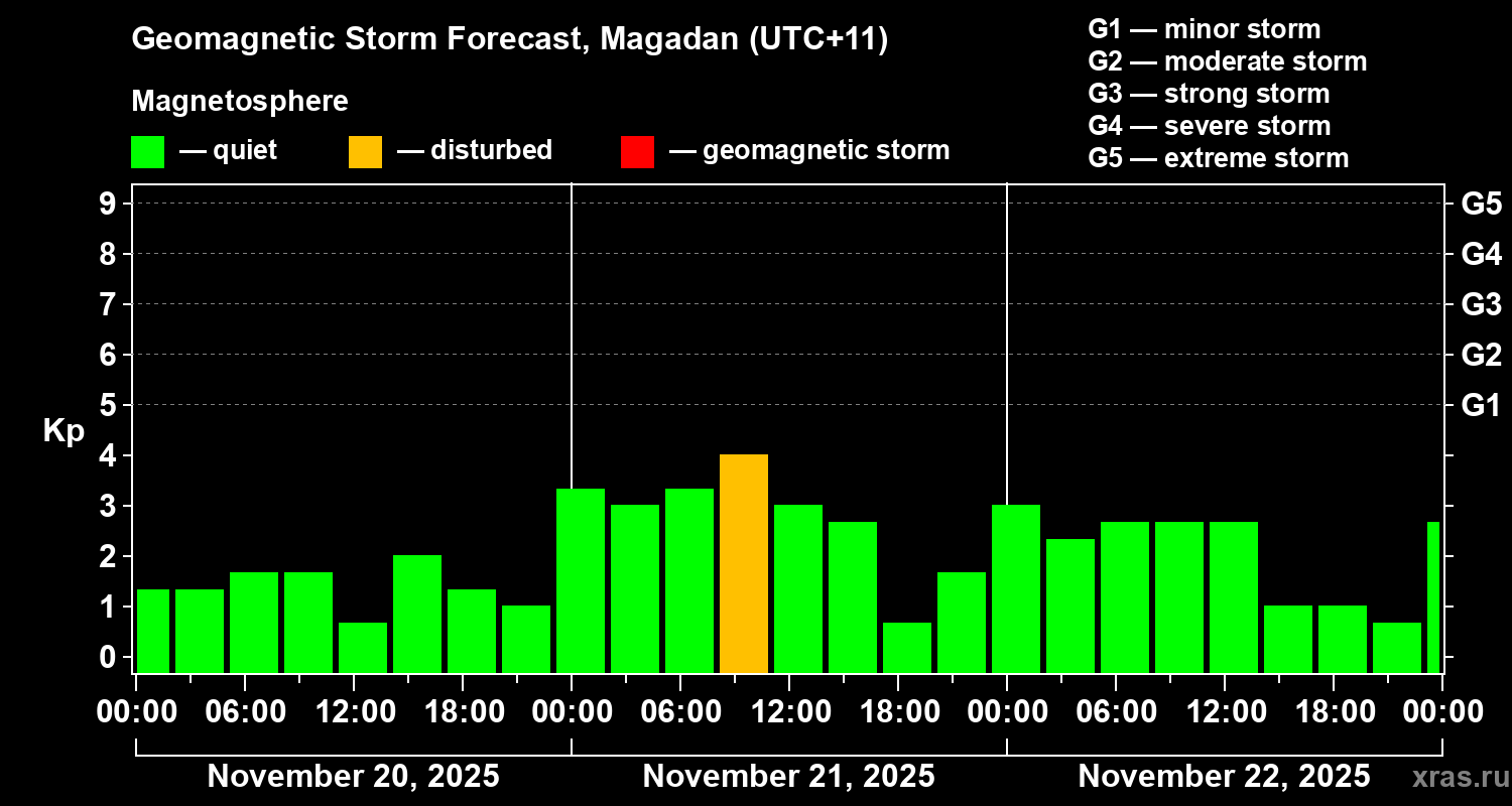 Geomagnetic storm forecast in Magadan for Nov 20, 2025