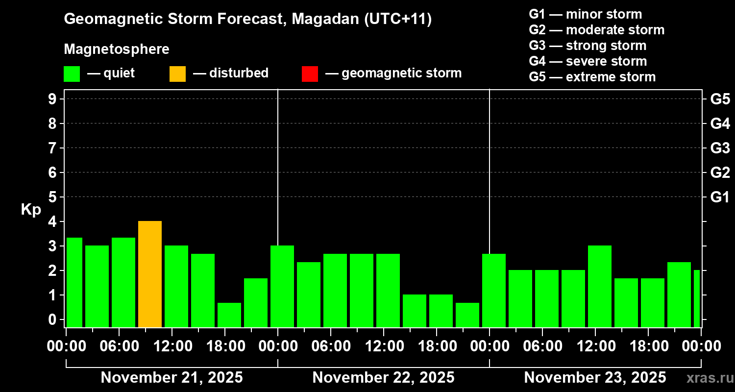 Geomagnetic storm forecast in Magadan for Nov 21, 2025