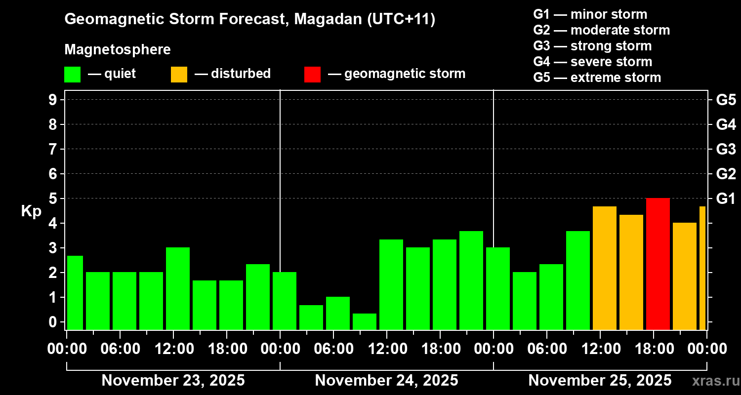 Geomagnetic storm forecast in Magadan for Nov 23, 2025