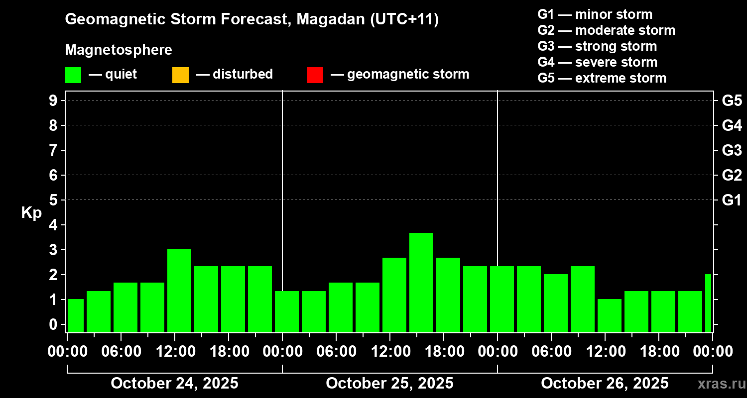 Geomagnetic storm forecast in Magadan for Oct 24, 2025