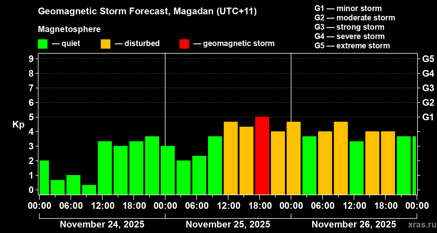 Geomagnetic storm forecast in Magadan for Nov 24, 2025