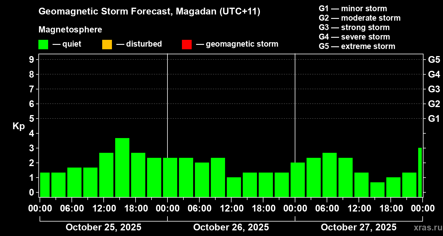 Geomagnetic storm forecast in Magadan for Oct 25, 2025