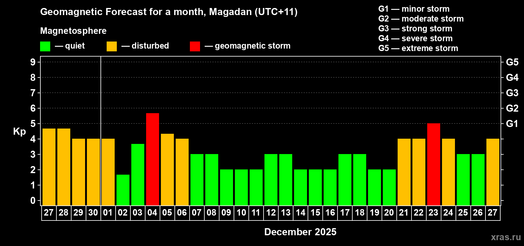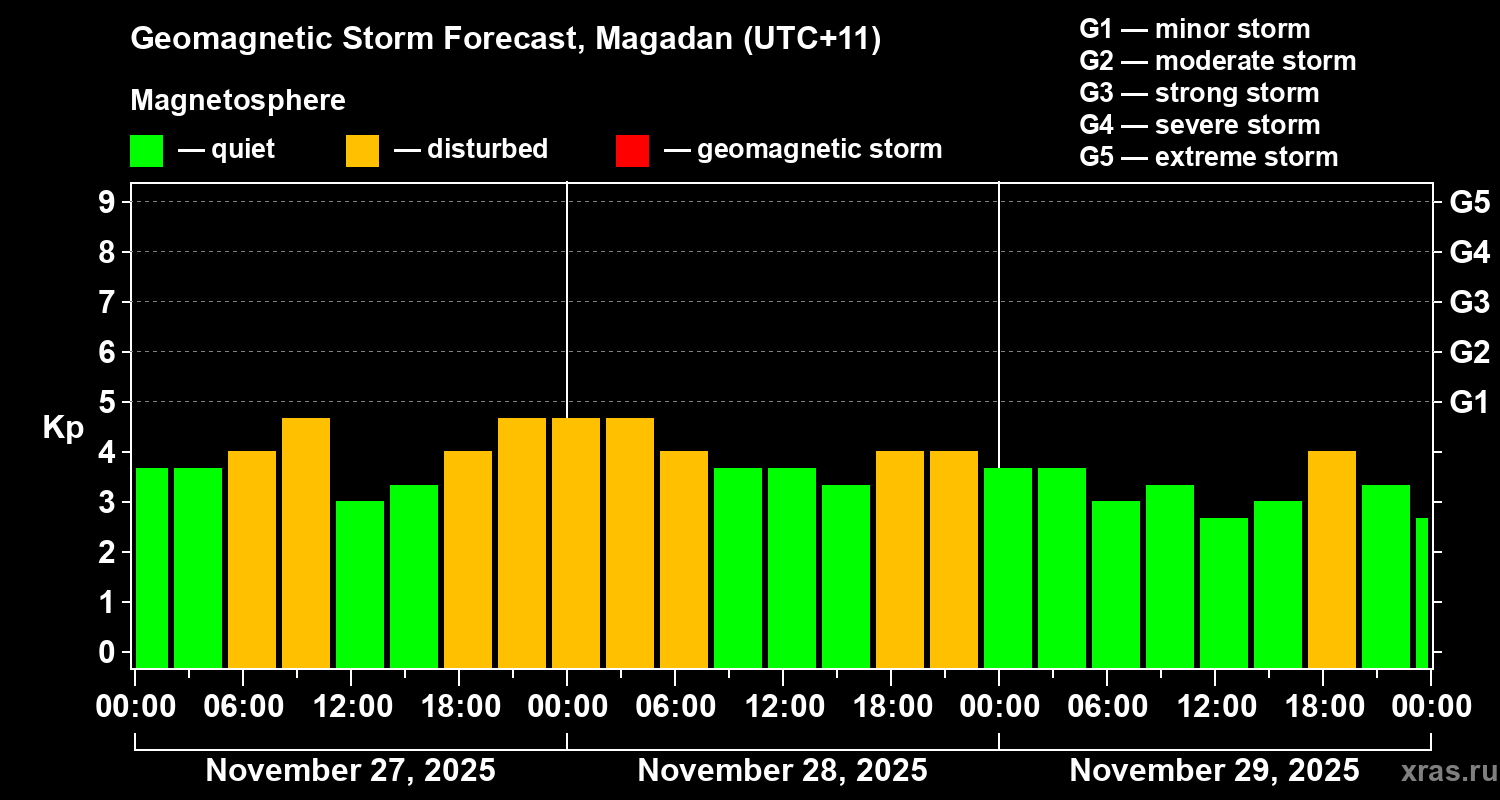 Geomagnetic storm forecast in Magadan for Nov 27, 2025