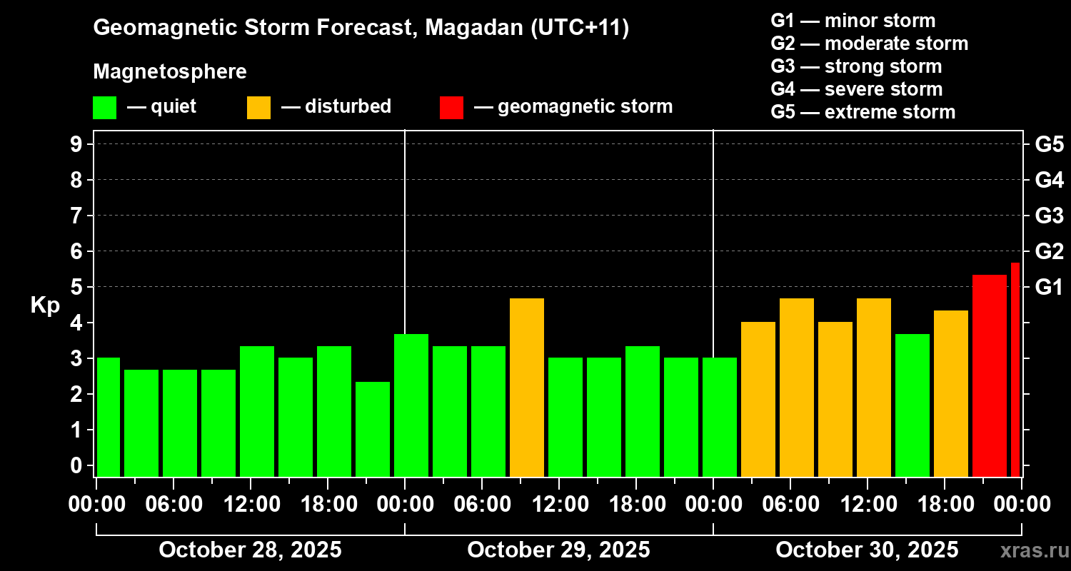 Geomagnetic storm forecast in Magadan for Oct 28, 2025