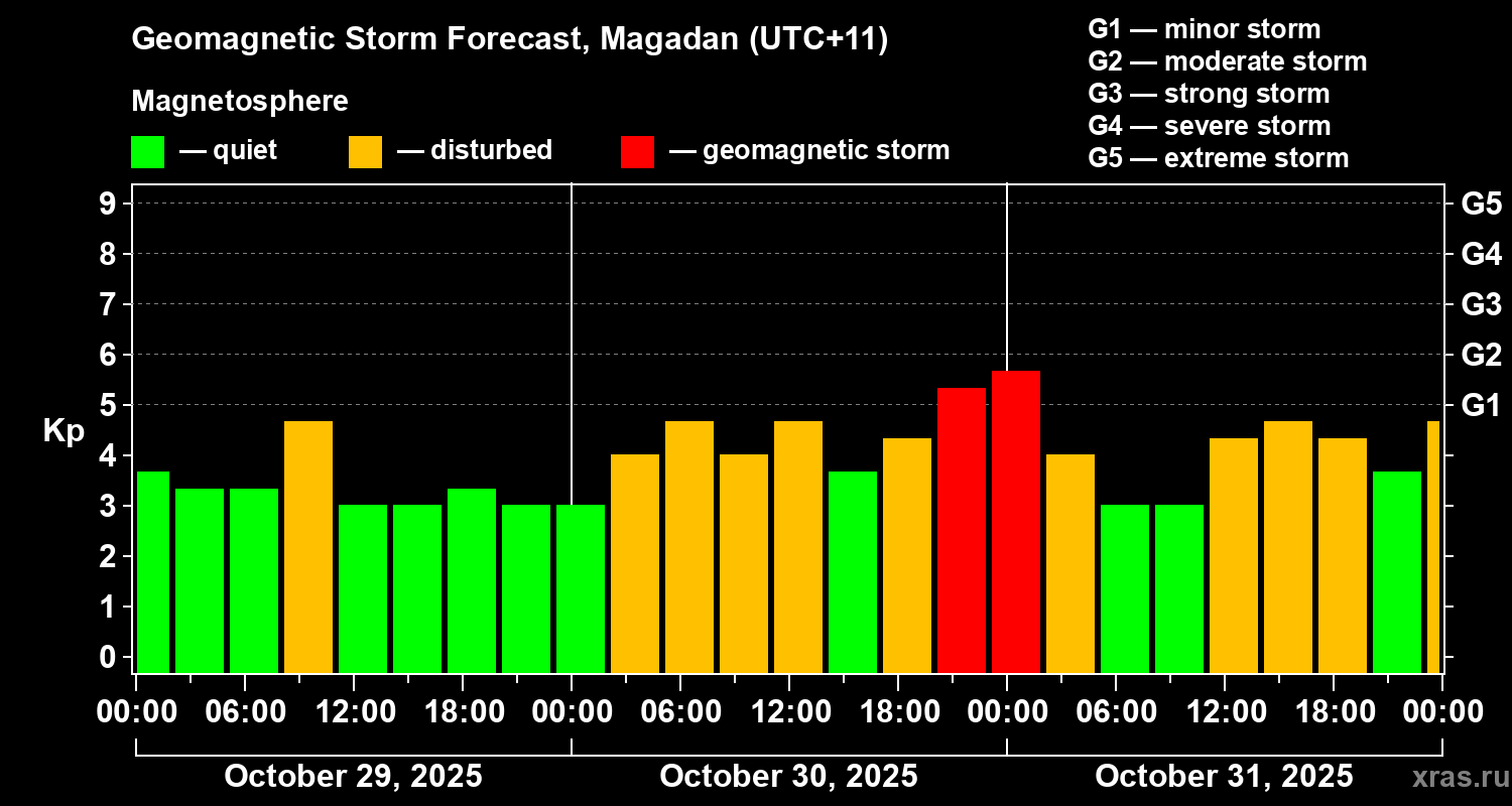 Geomagnetic storm forecast in Magadan for Oct 29, 2025