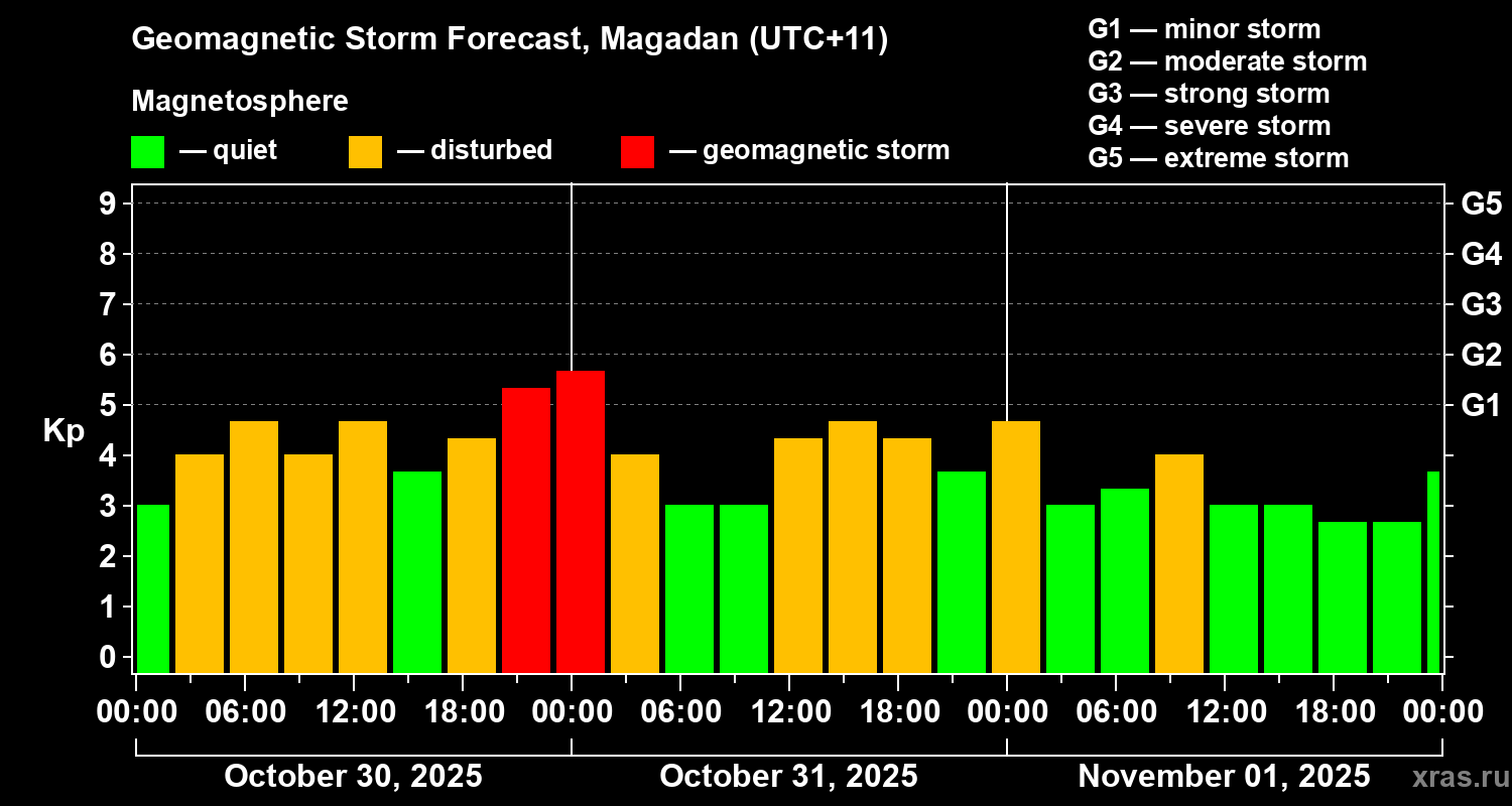 Geomagnetic storm forecast in Magadan for Oct 30, 2025