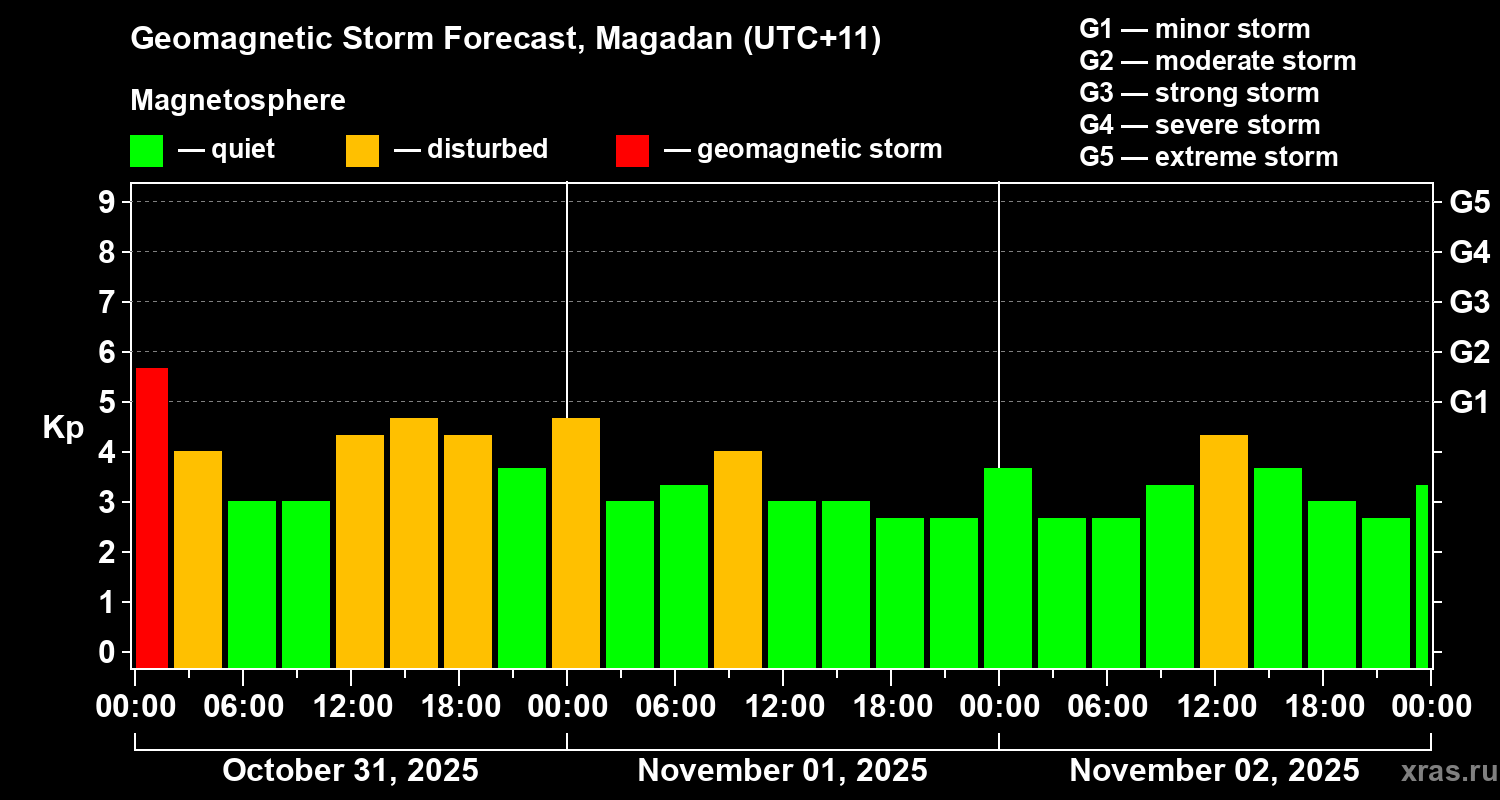 Geomagnetic storm forecast in Magadan for Oct 31, 2025