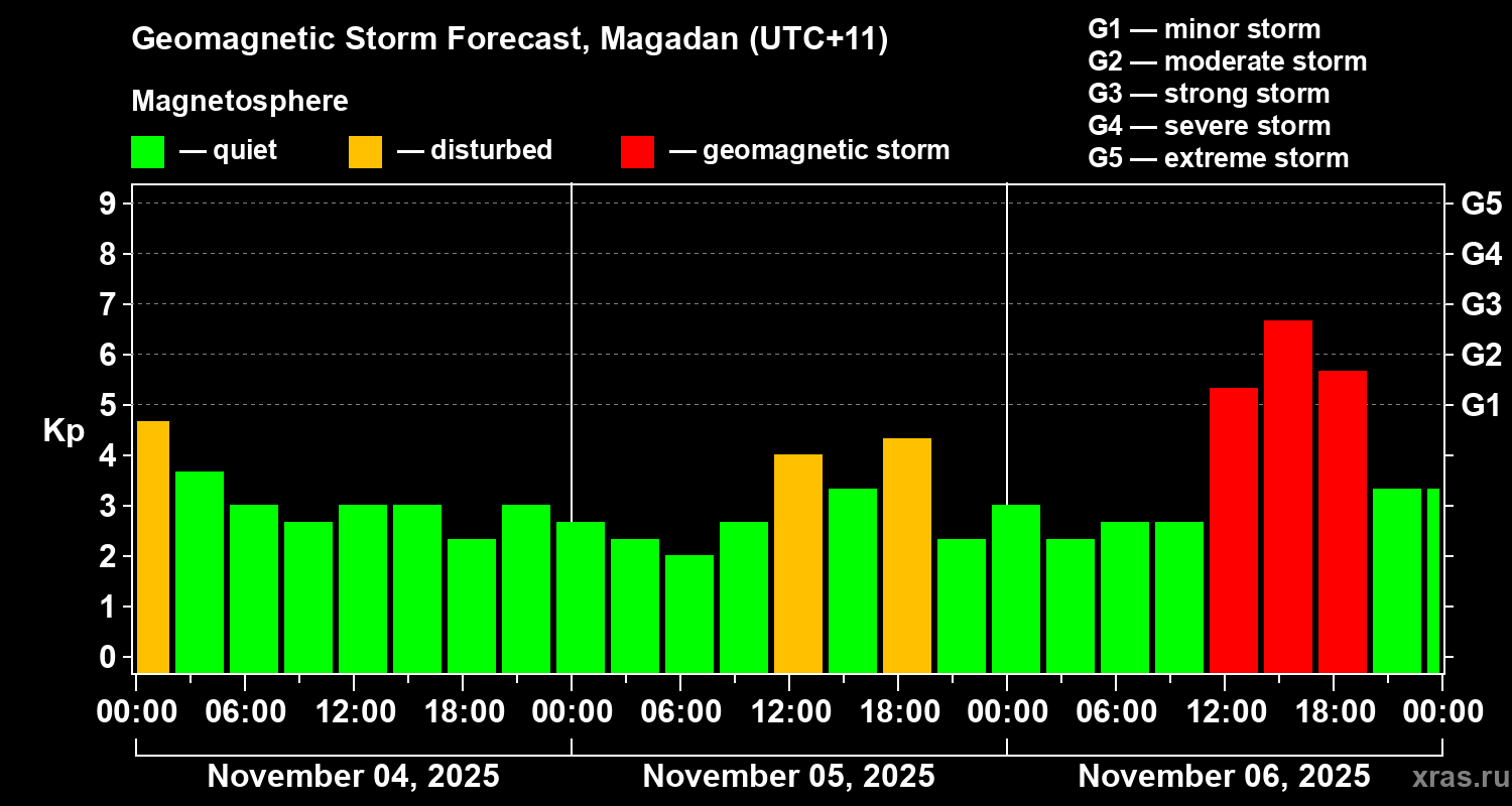 Geomagnetic storm forecast in Magadan for Nov 04, 2025