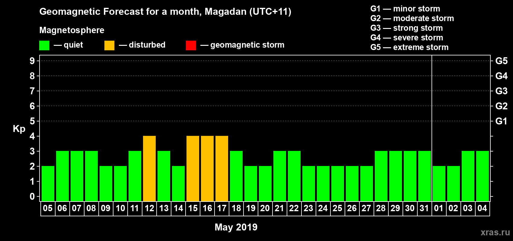 Geomagnetic storm forecast in Magadan for May 05, 2019
