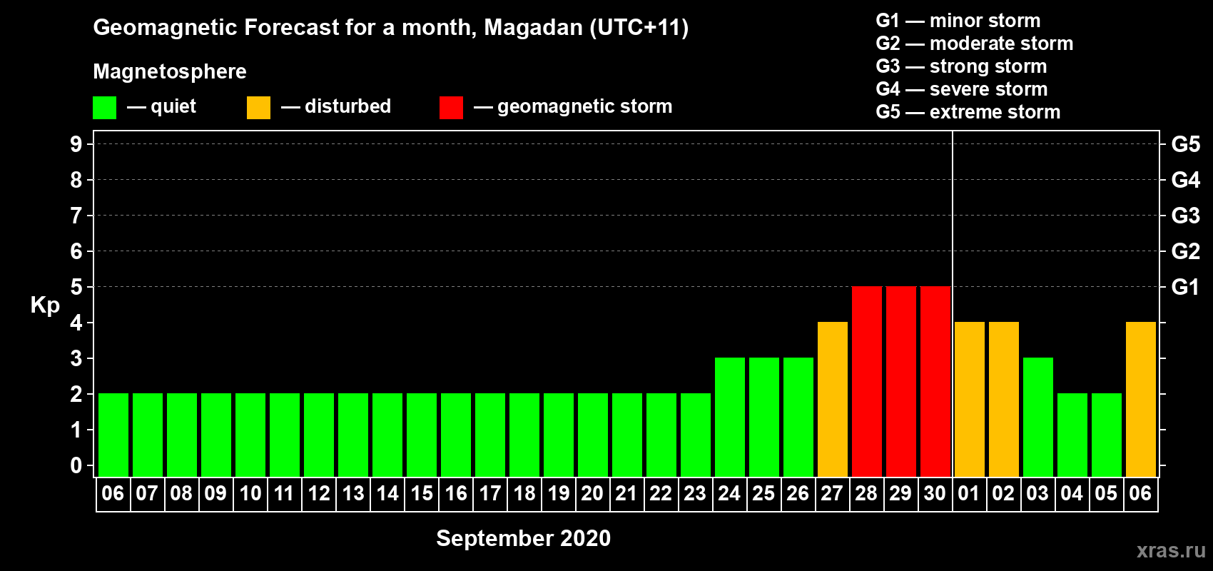 Geomagnetic storm forecast in Magadan for Sep 06, 2020