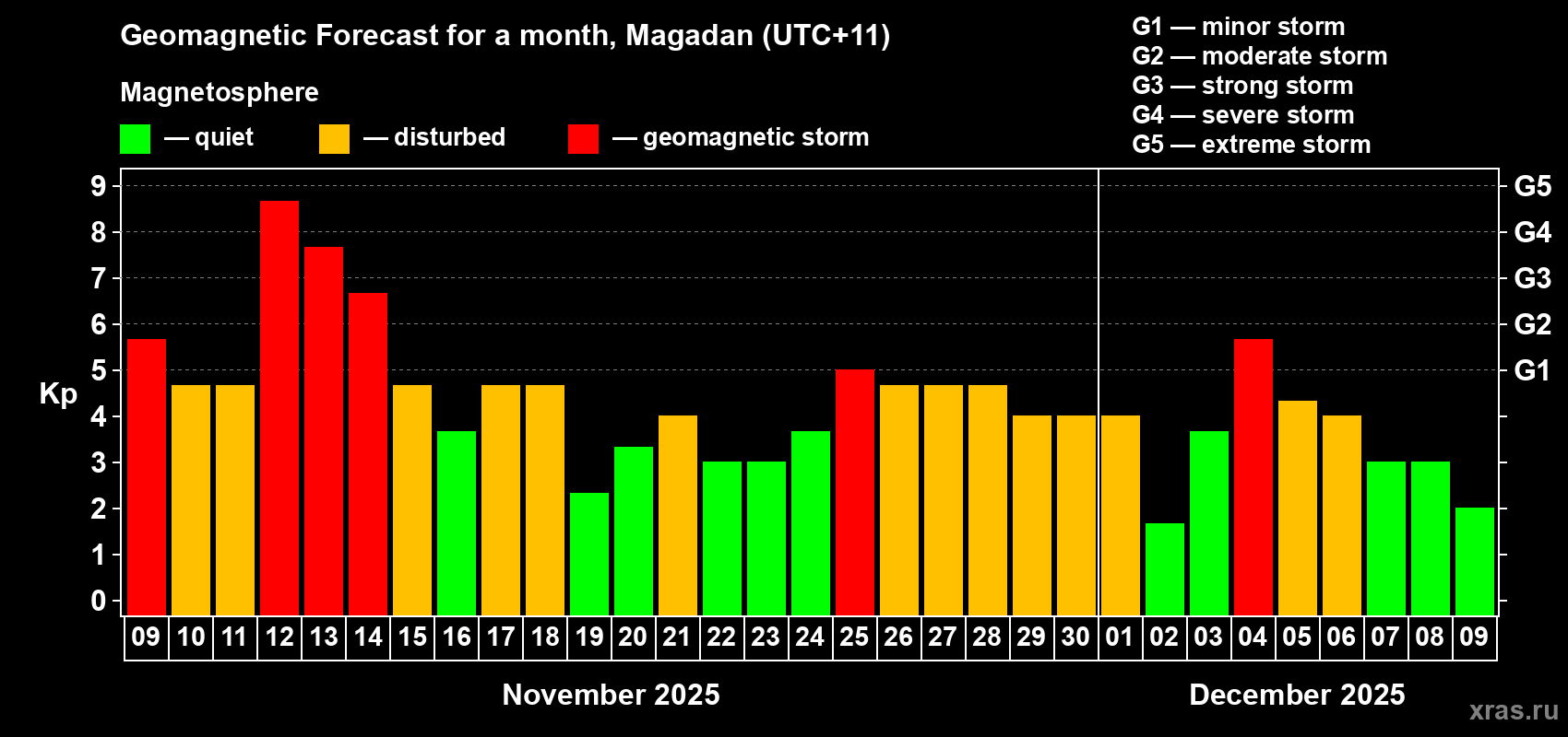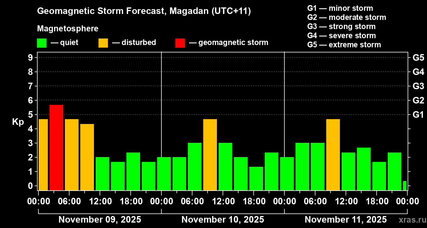 Geomagnetic storm forecast in Magadan for Nov 09, 2025