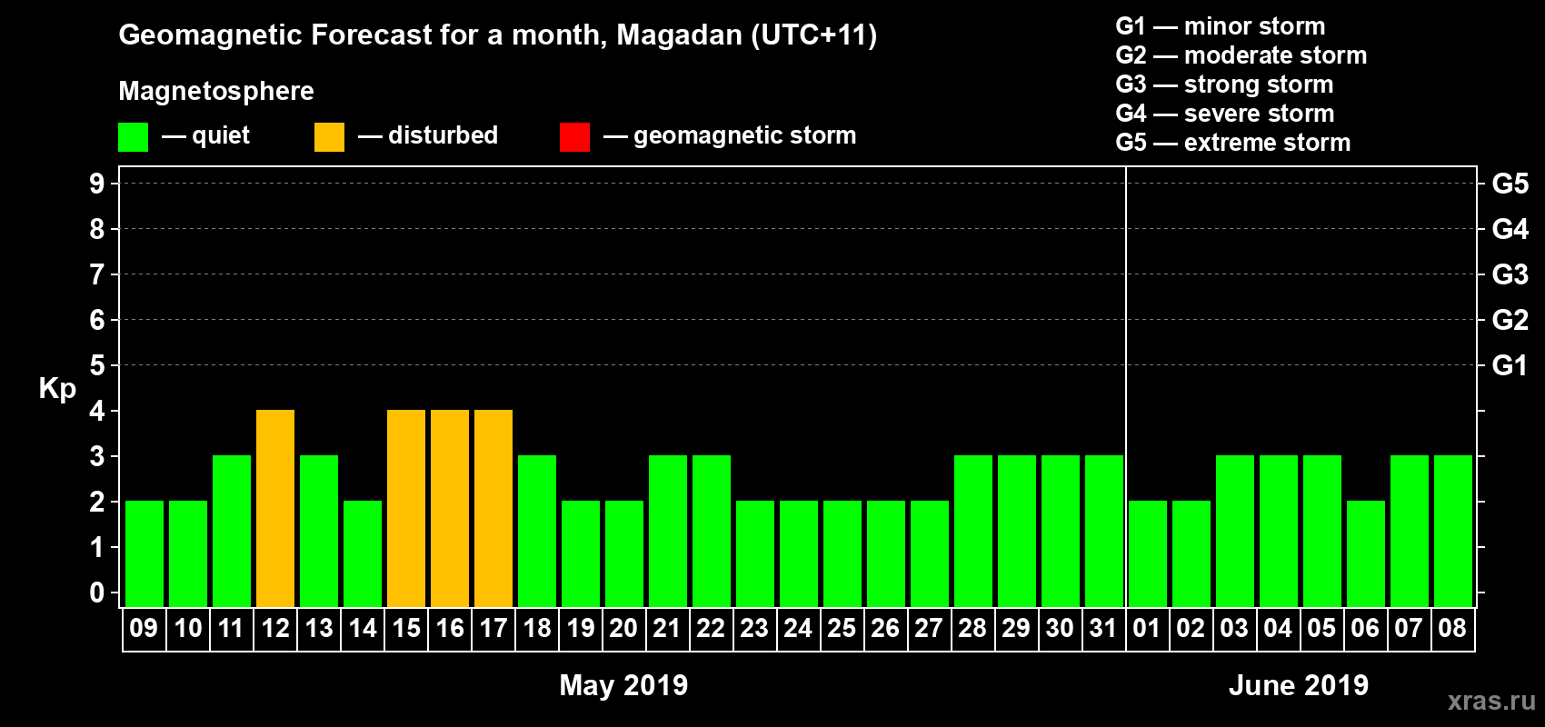 Geomagnetic storm forecast in Magadan for May 09, 2019