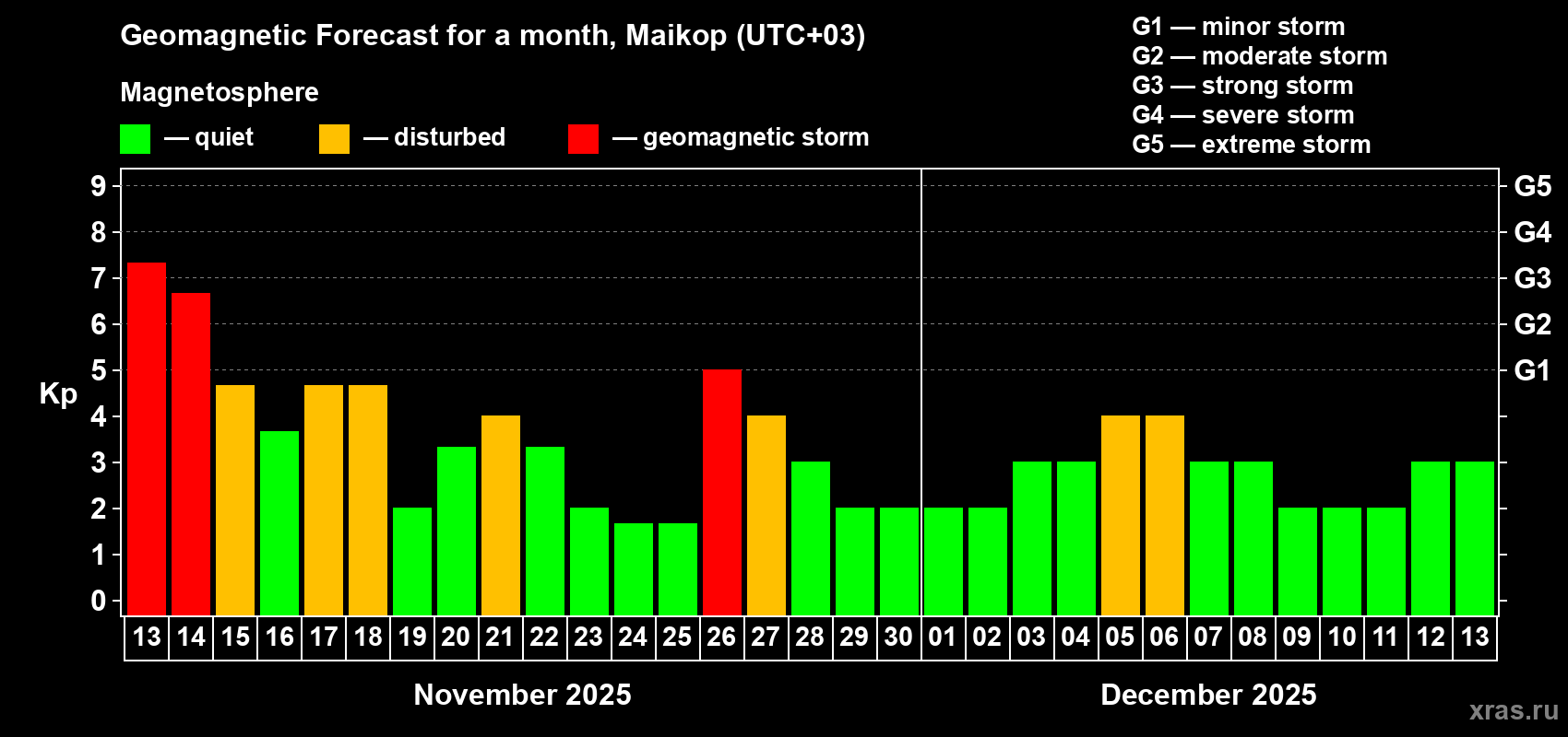 Geomagnetic storm forecast in Maikop for Nov 13, 2025