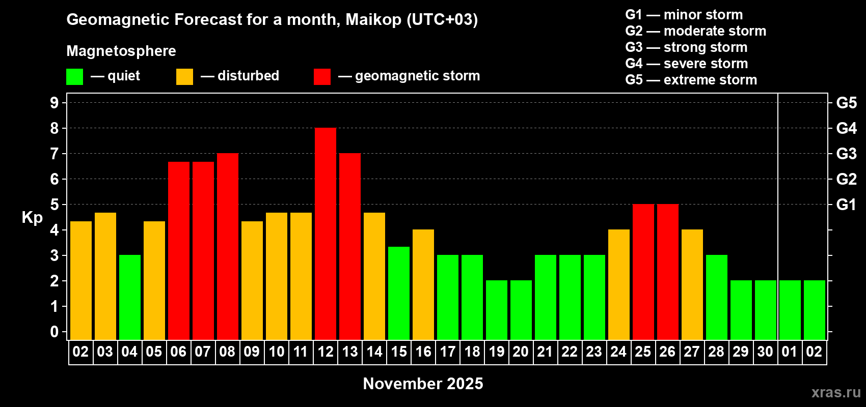 Geomagnetic storm forecast in Maikop for Nov 02, 2025