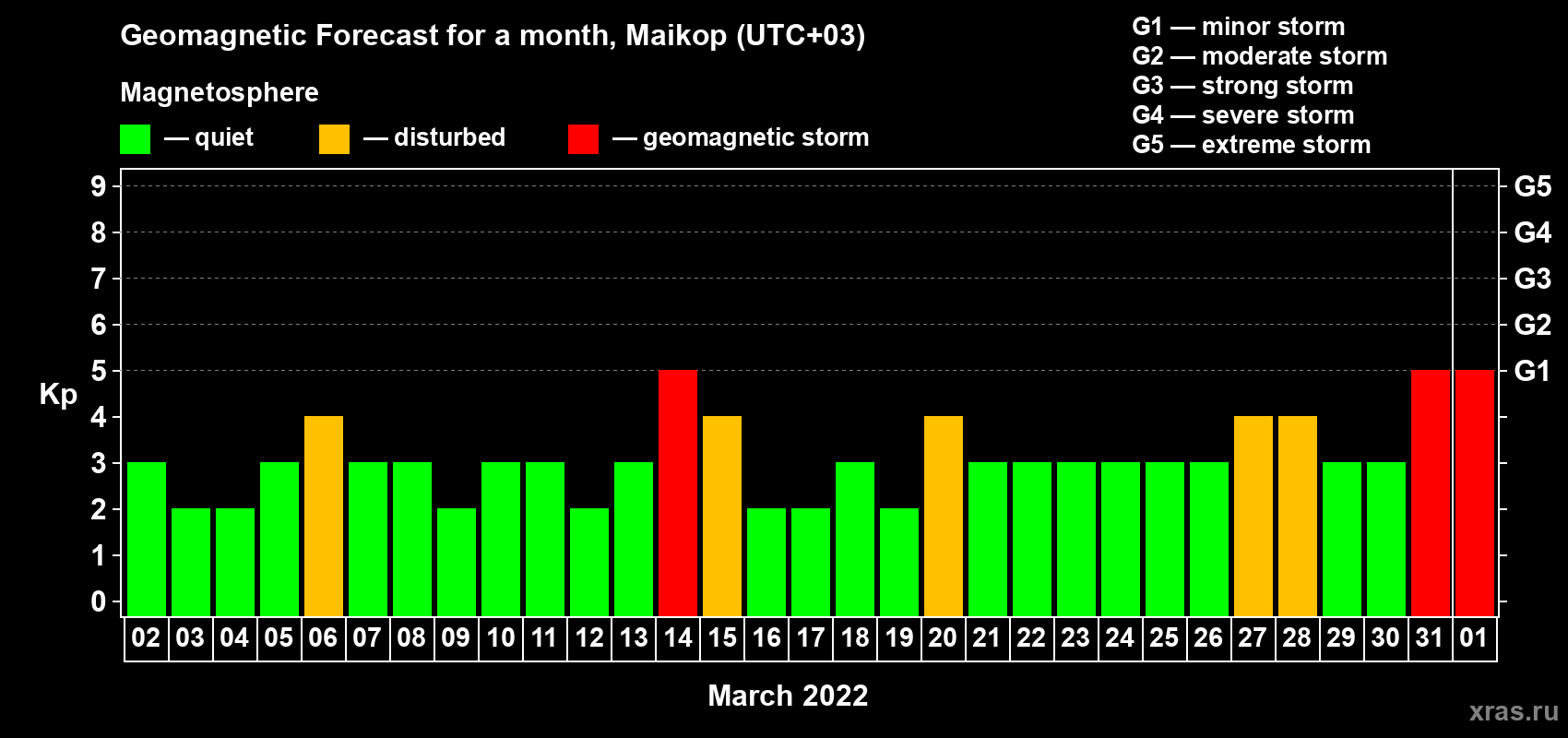 Geomagnetic storm forecast in Maikop for Mar 02, 2022