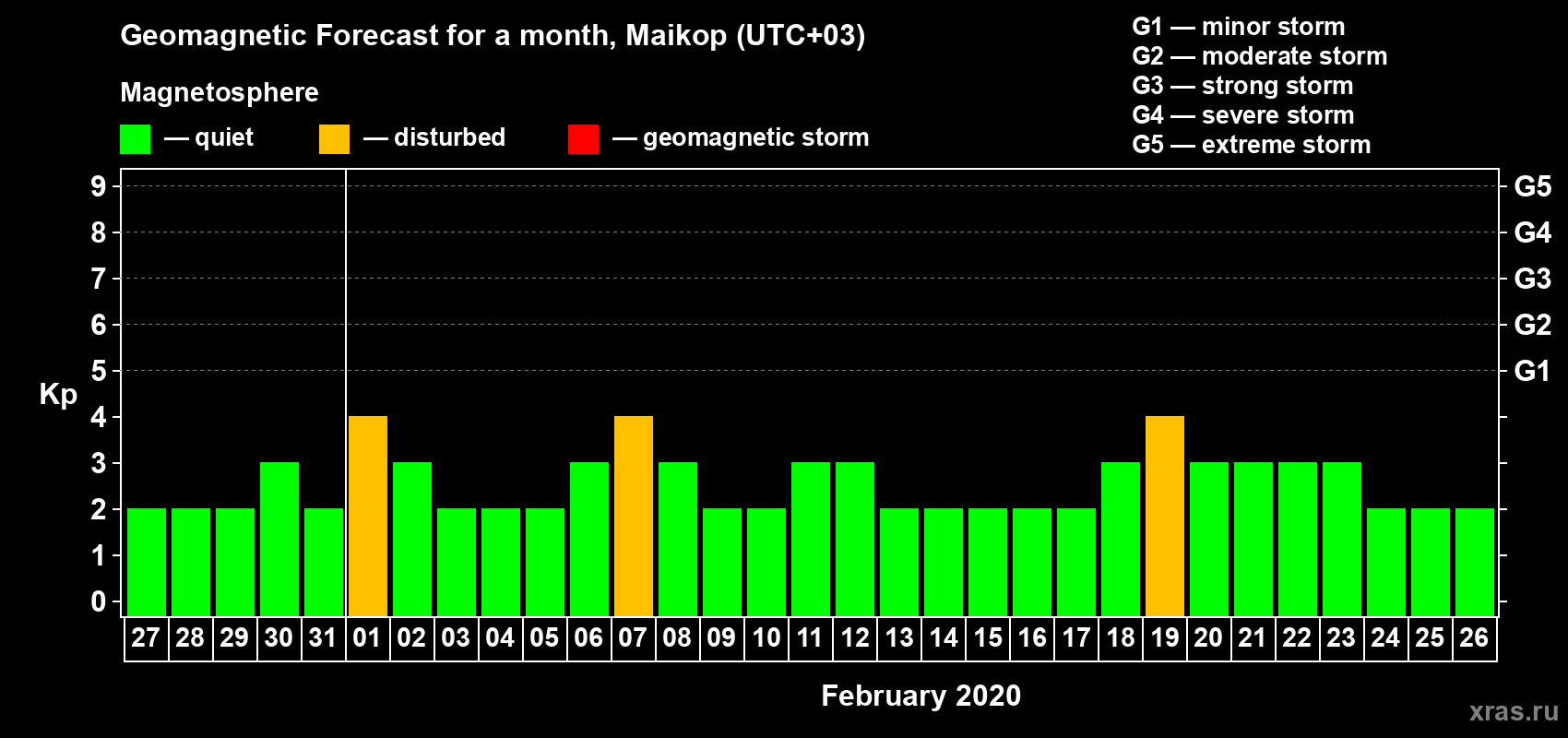Geomagnetic storm forecast in Maikop for Jan 27, 2020