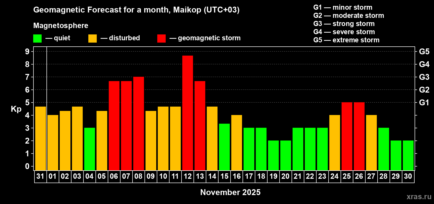 Geomagnetic storm forecast in Maikop for Oct 31, 2025